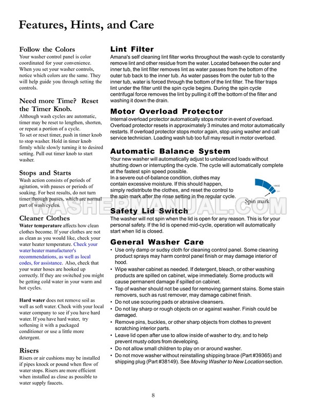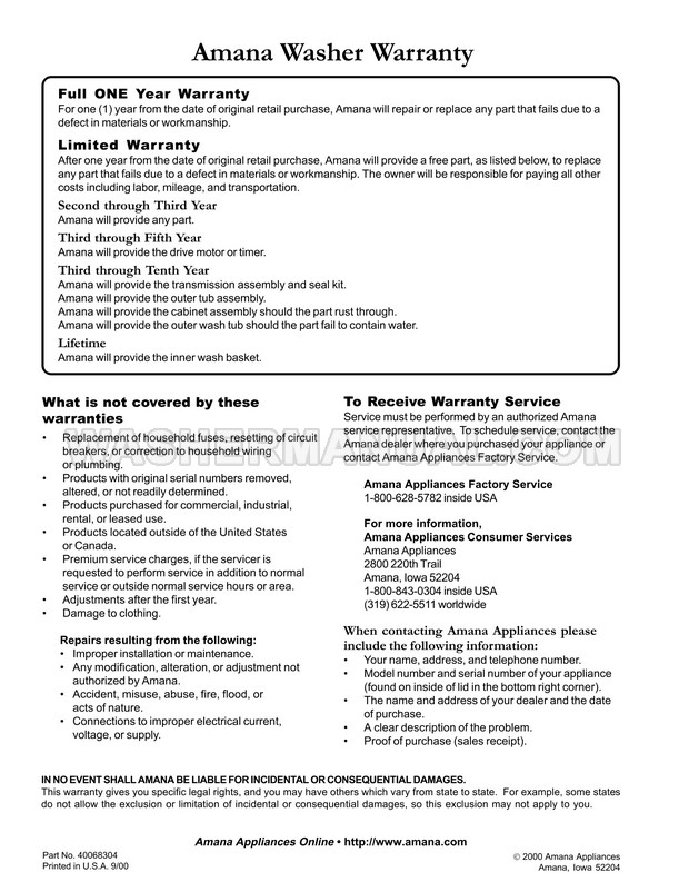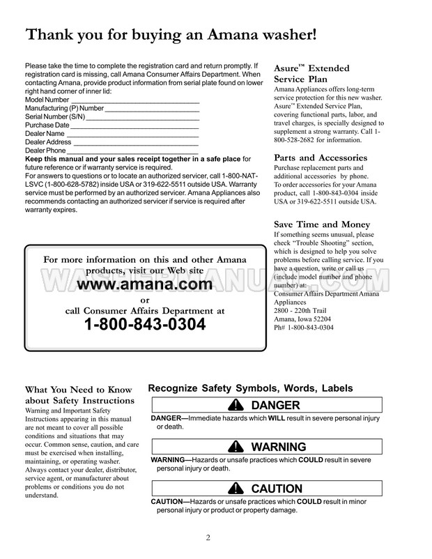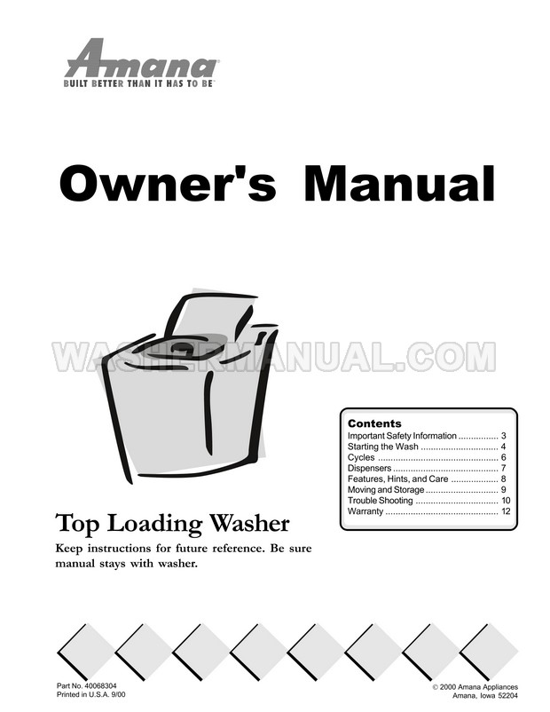 Washer Manual Amana ALW480DAW Owner's Manual Amana ALW480DAW Owner's Manual Rating 5.0 (votes: 2) Description Owner's manual for Amana ALW480DAW laundry machine with top load on 12 pages.