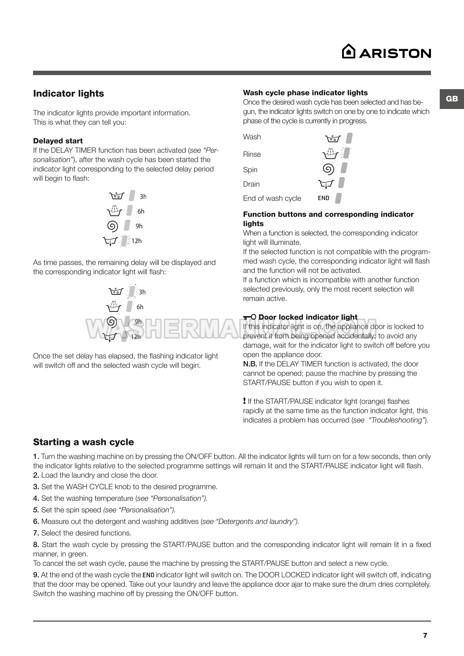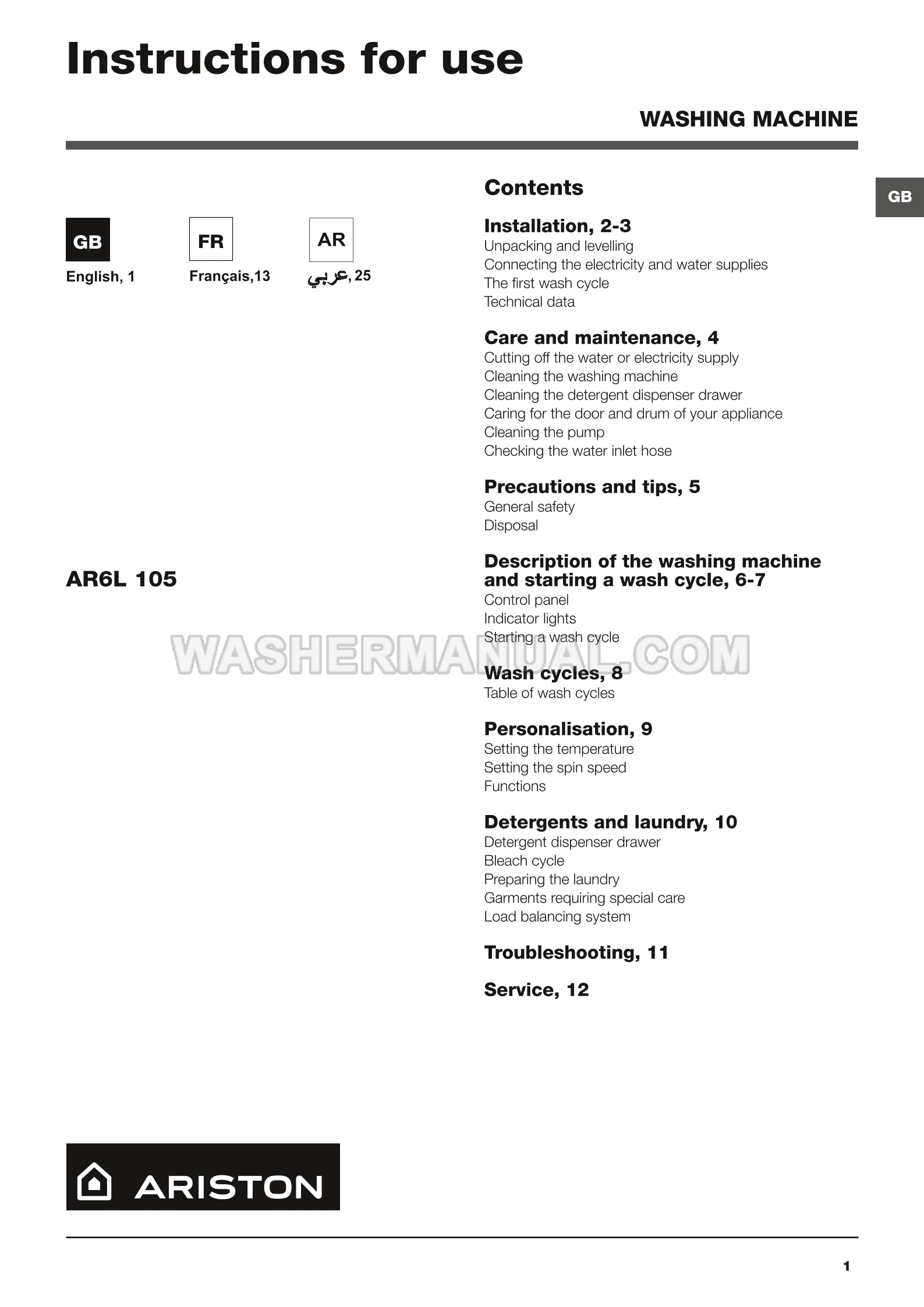 Instructions for use for Ariston AR6L 105 freestanding 7 kg washing machine with 1000 rpm spin featuring multiple cotton, synthetic and quick-wash programs for efficient everyday laundry care (AR6L105 EX) with front load on 12 pages.