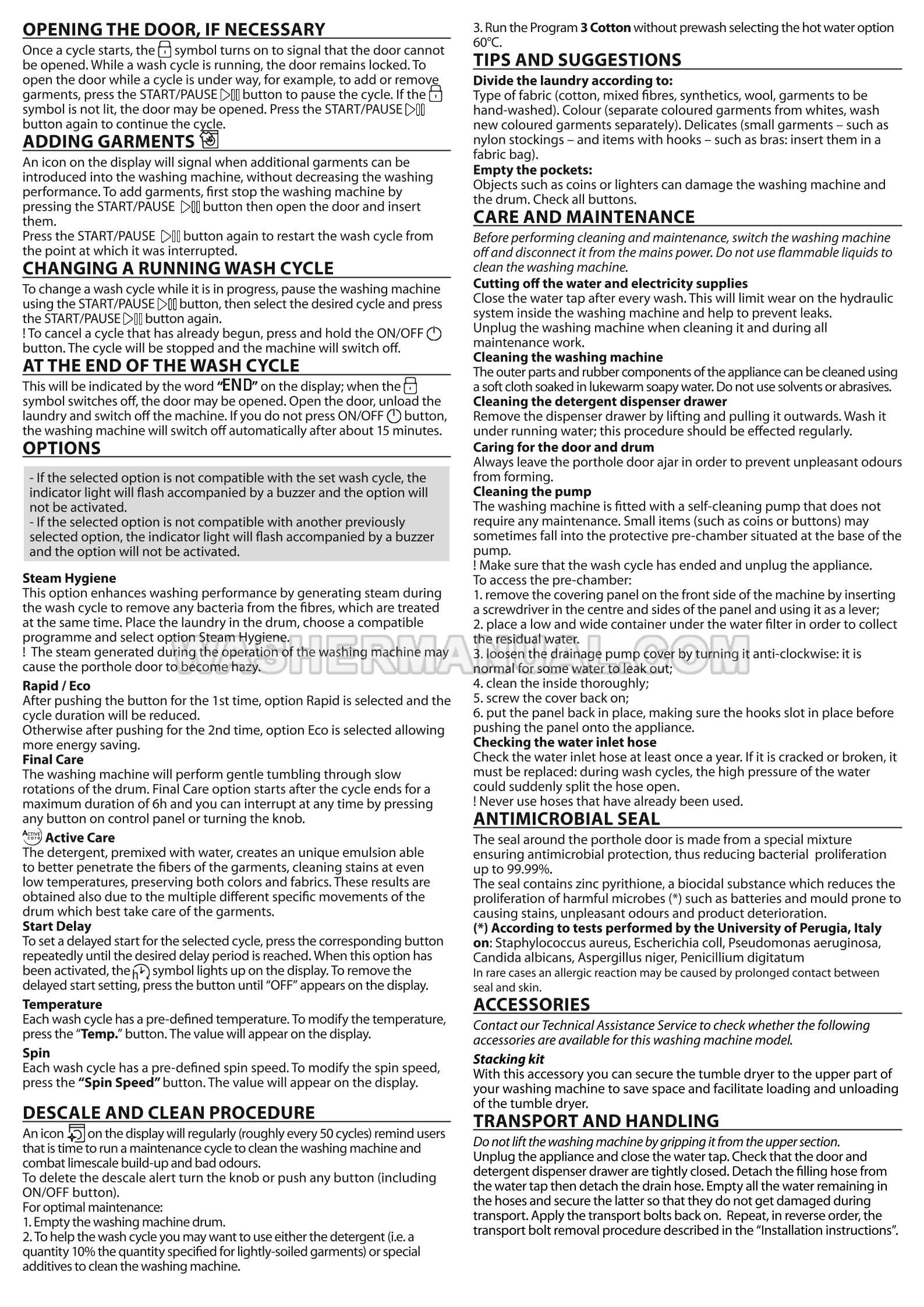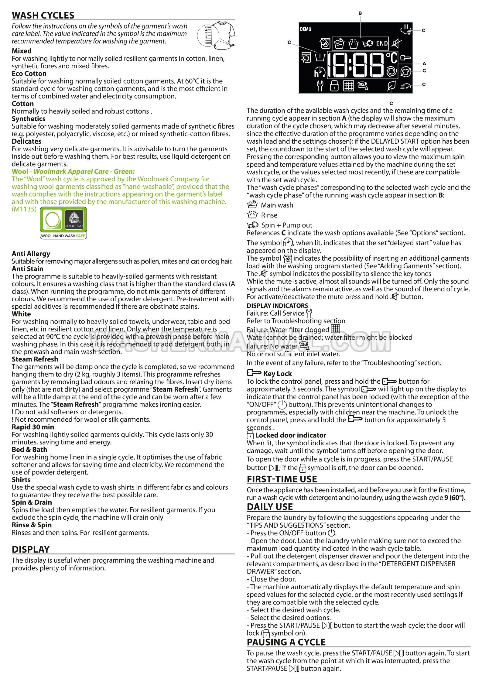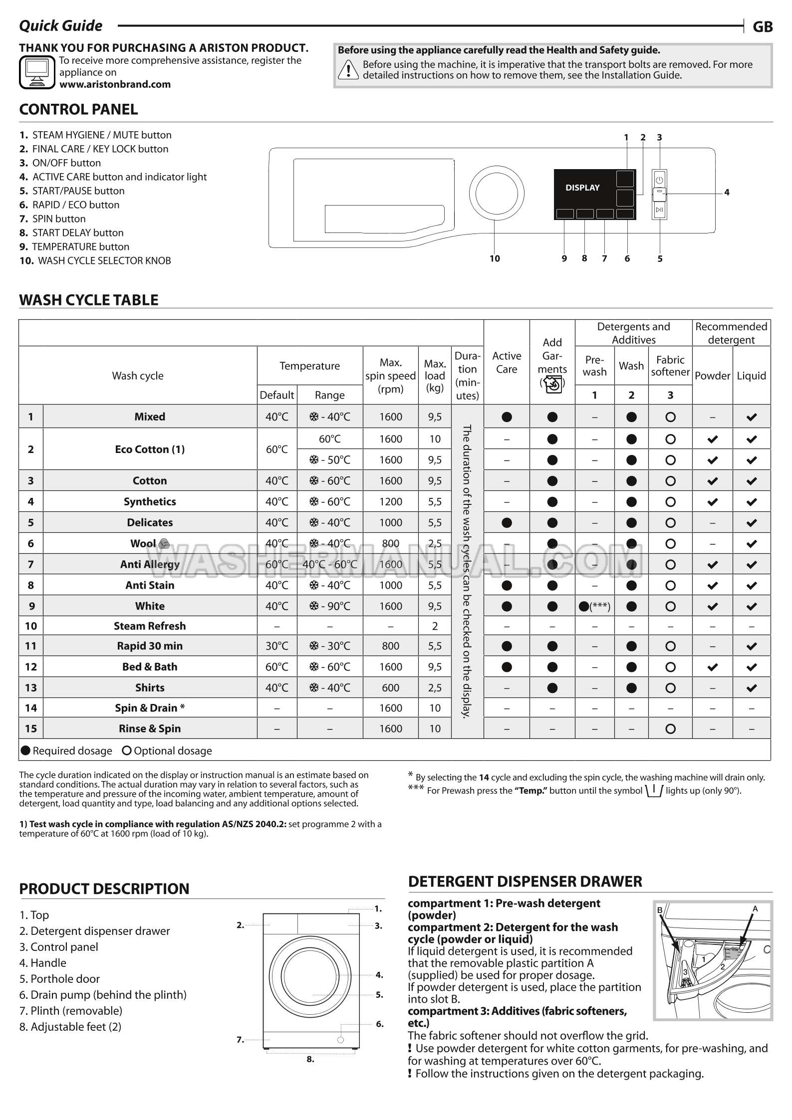 Quick guide for Ariston N106 WAAU energy-efficient 10kg front load washing machine offering 1600 RPM spin speed and active care technology with digital motion control and steam refresh functionality for superior cleaning on 4 pages.