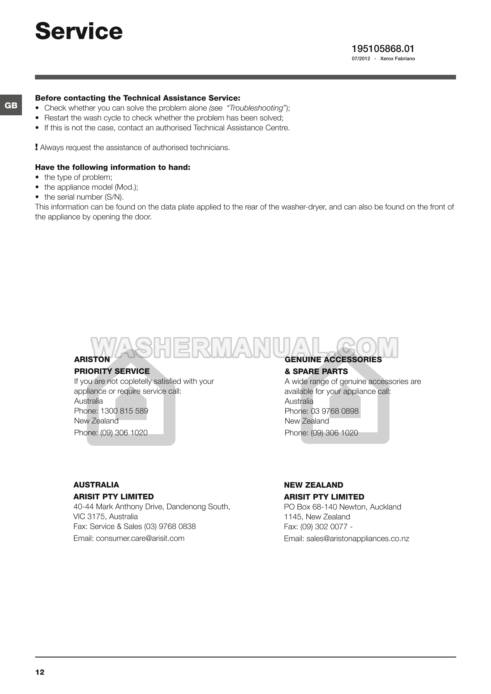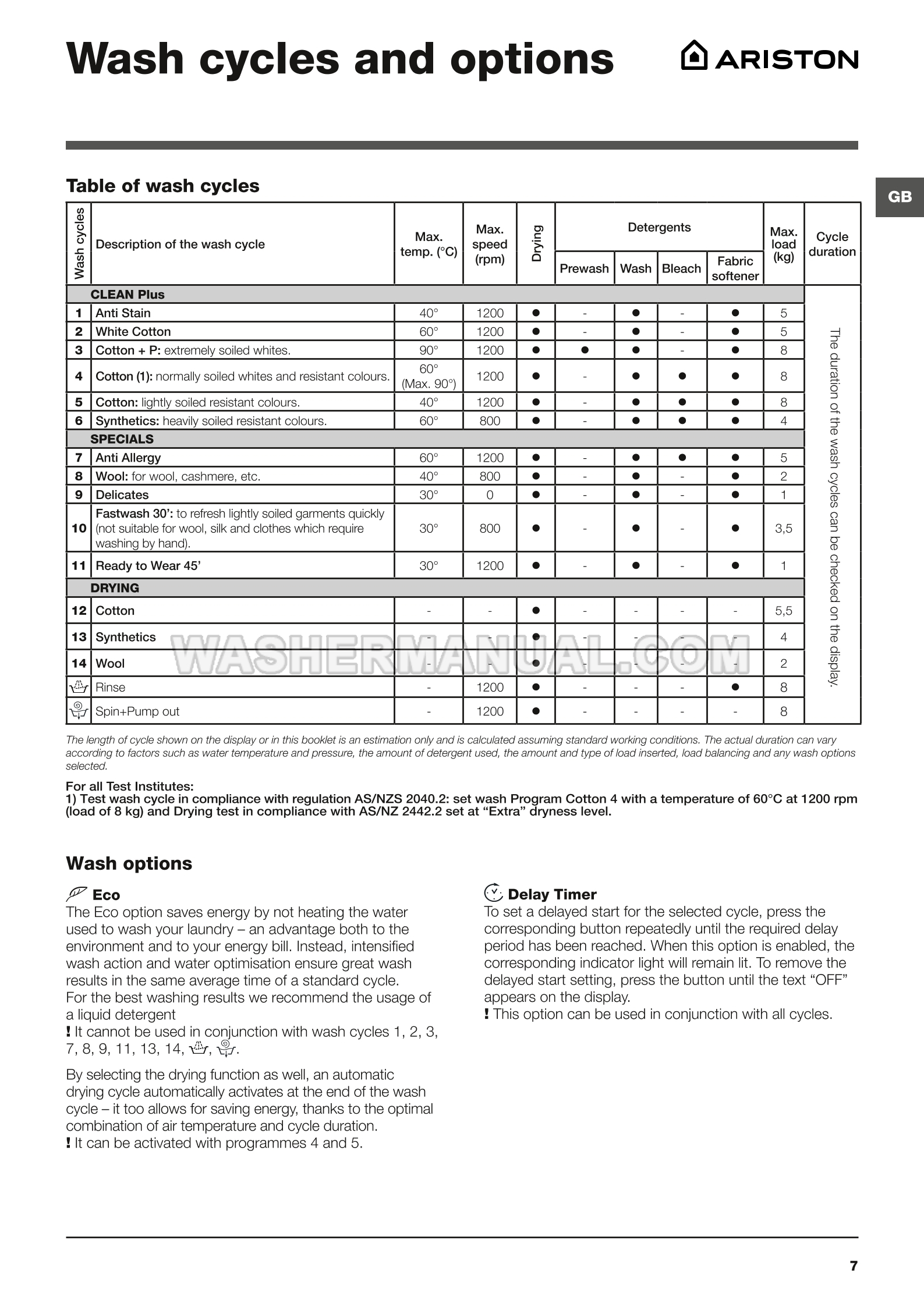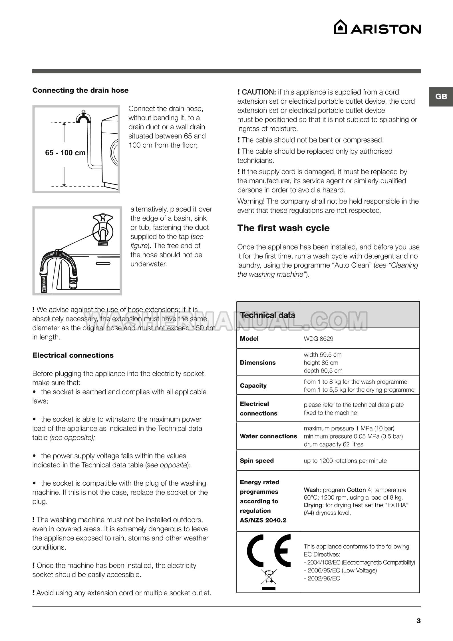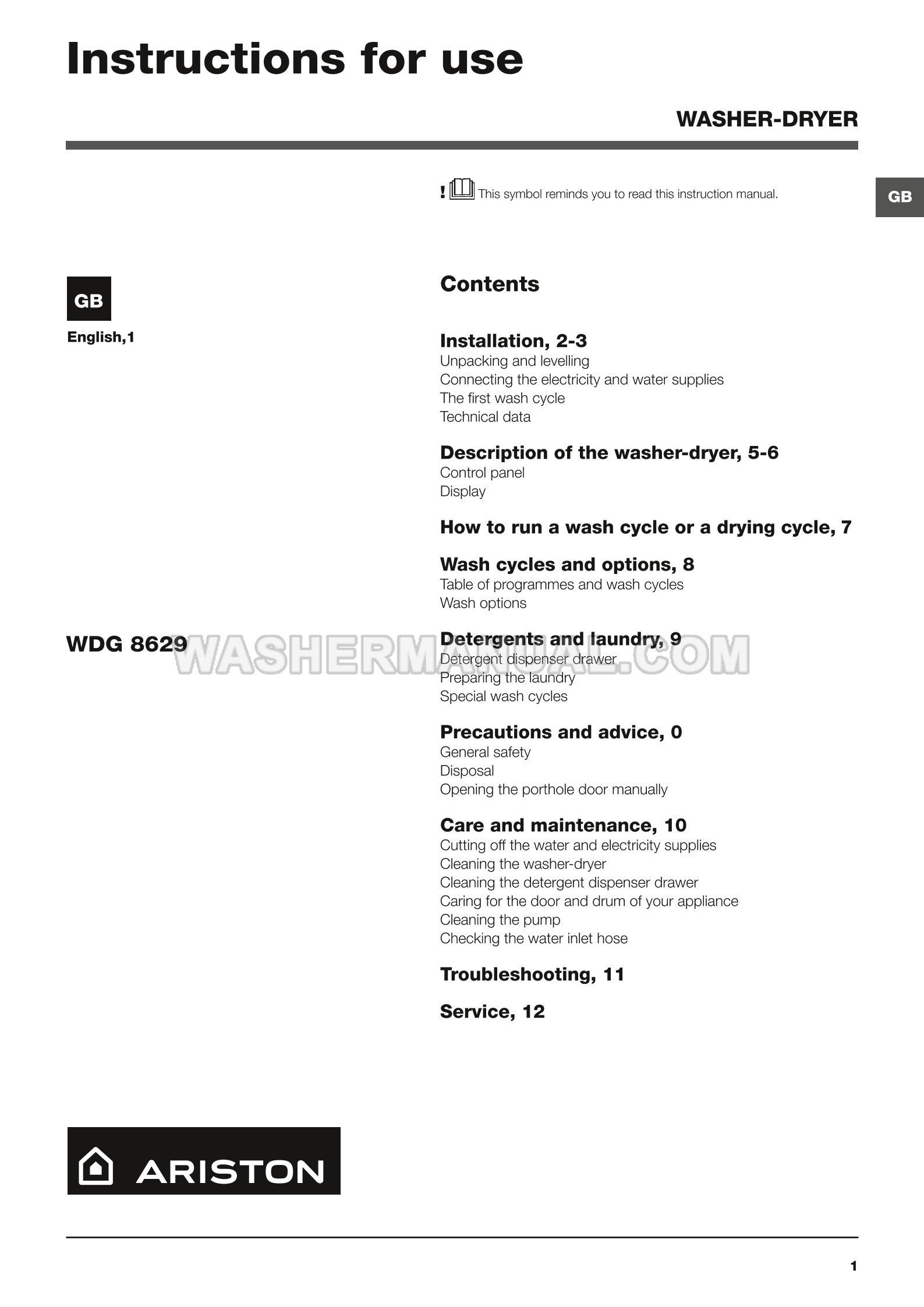 Instructions for use for Ariston WDG8629B AUS advanced 8kg washer and 5.5kg dryer combination unit offering 1200 RPM spin speed with automatic load balancing, delay timer, and specialized programs for gentle and powerful cleaning laundry machine on 12 pages.