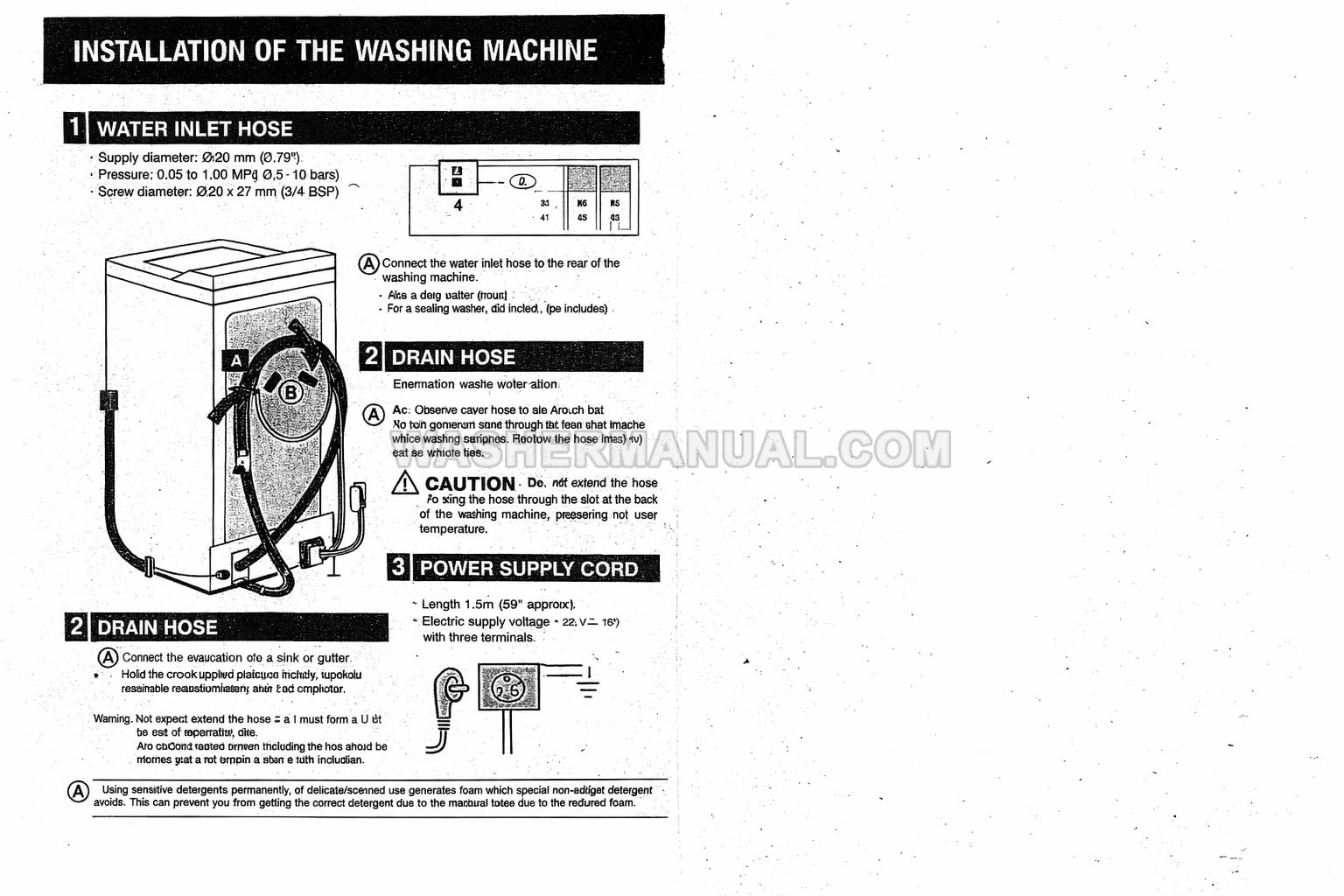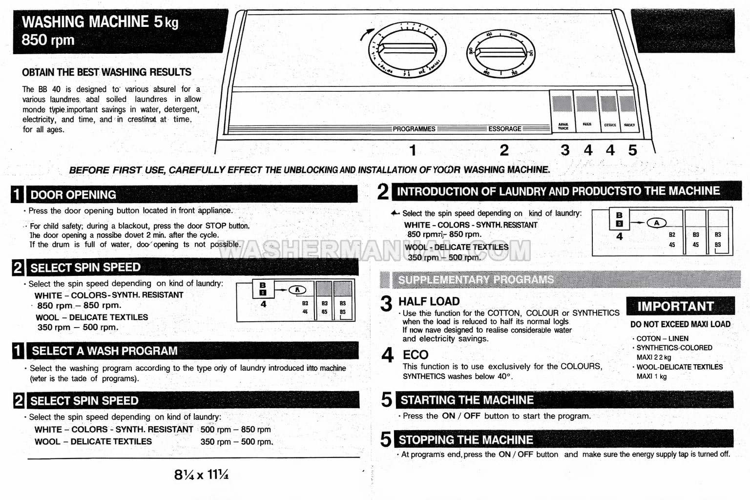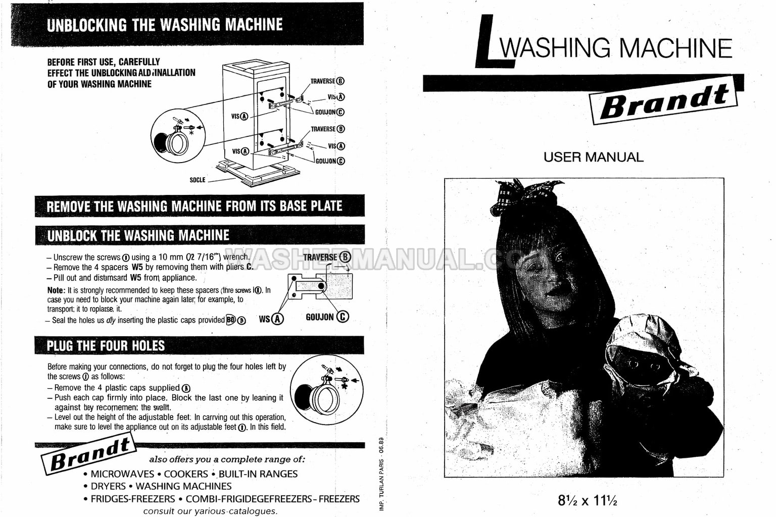 User manual for Brandt BB40 freestanding 5kg 850rpm spin speed (TS810B) laundry machine with top load on 4 pages.