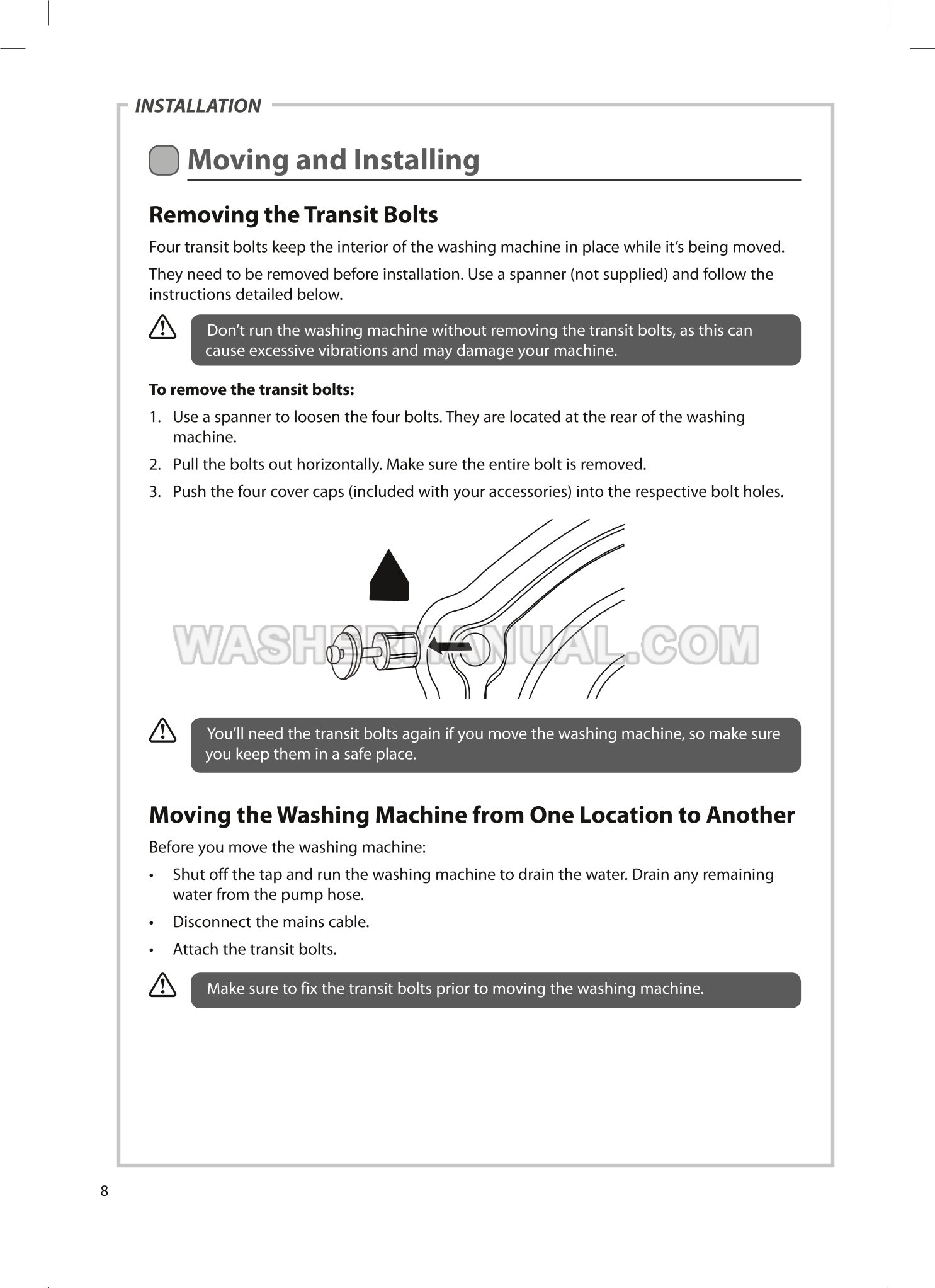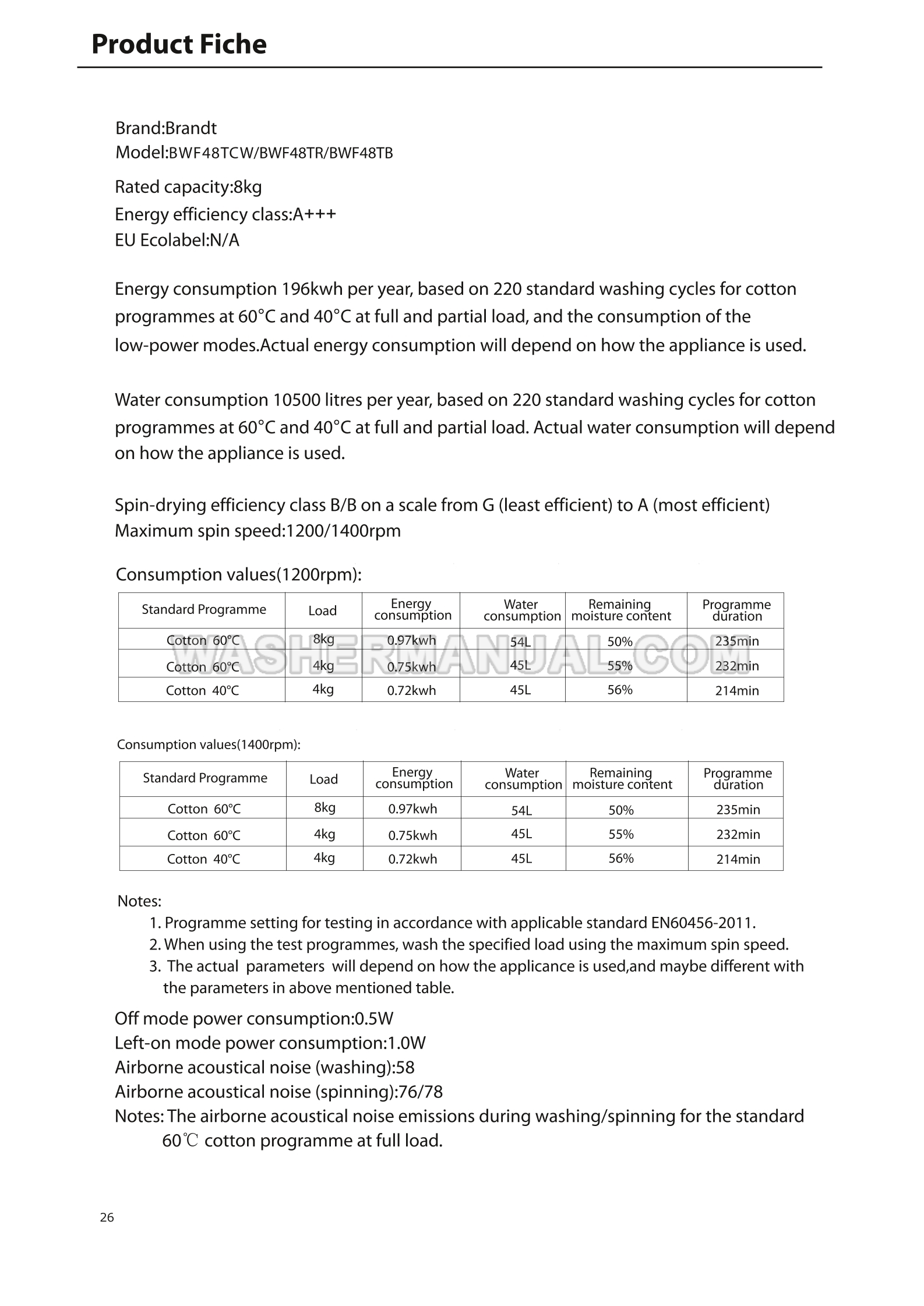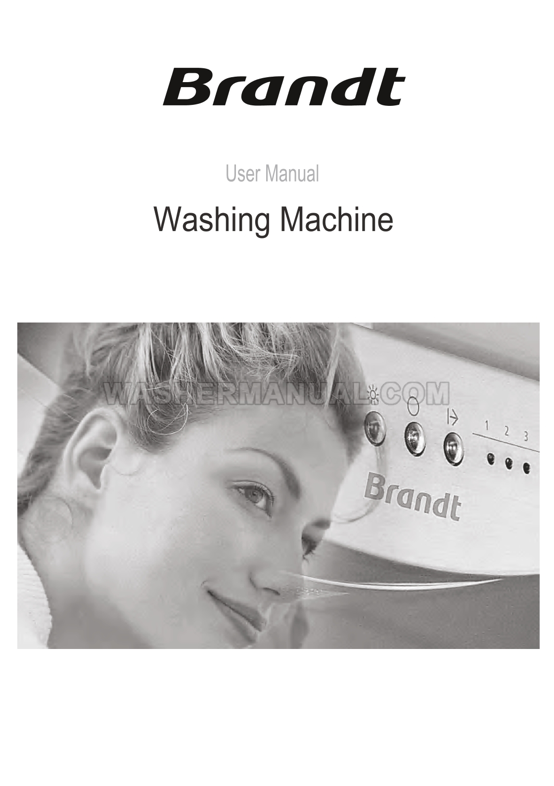 User manual for Brandt BWF48TB 8kg capacity, 1400rpm spin speed and 60L drum, combining A+++ energy efficiency with Aquaboost 3 technology and quiet 58dBA washing performance laundry machine with front load on 27 pages.