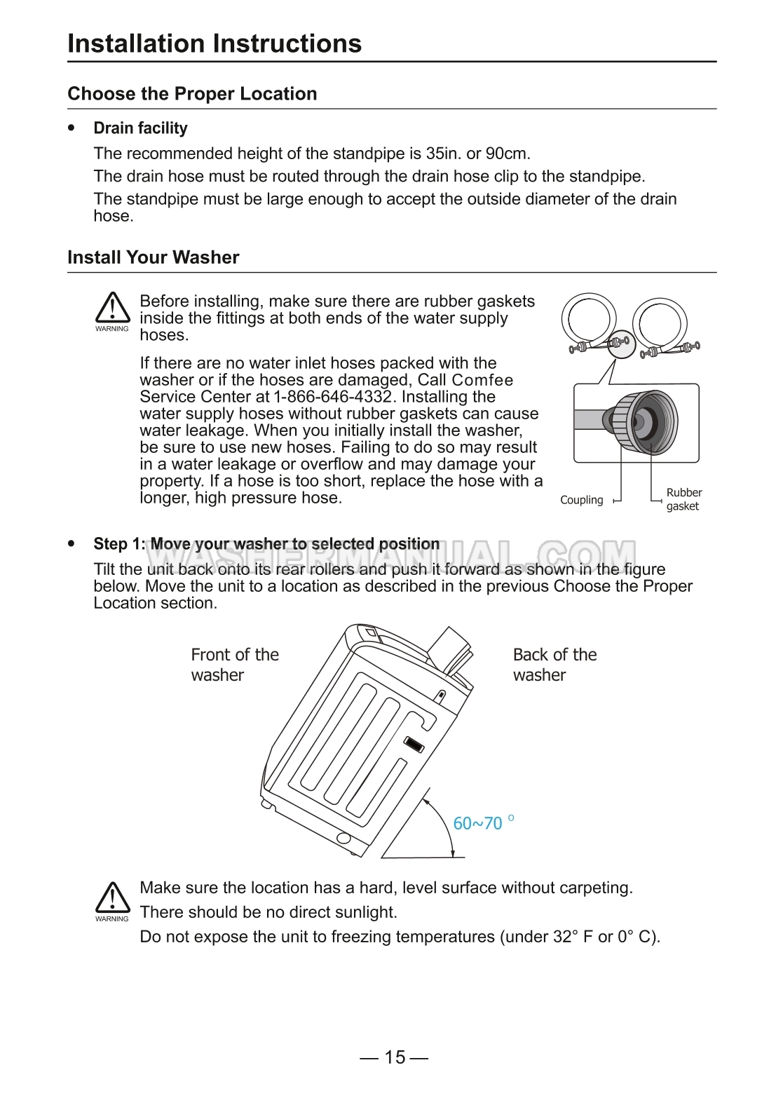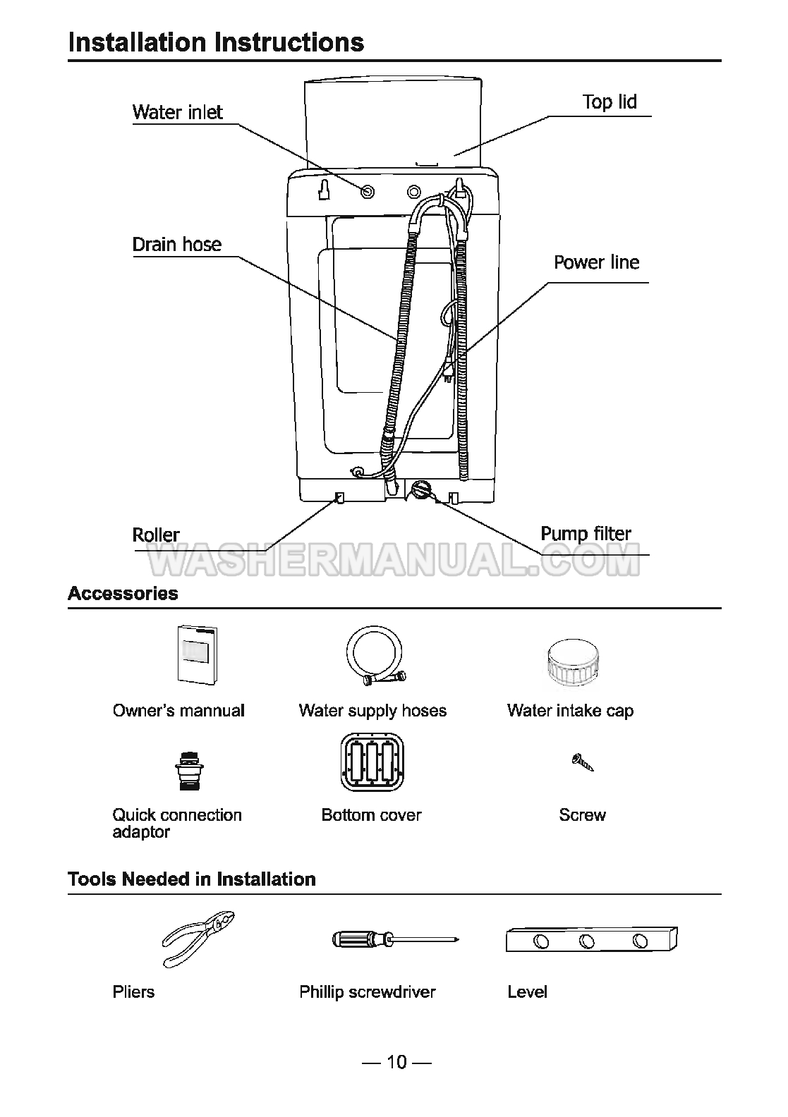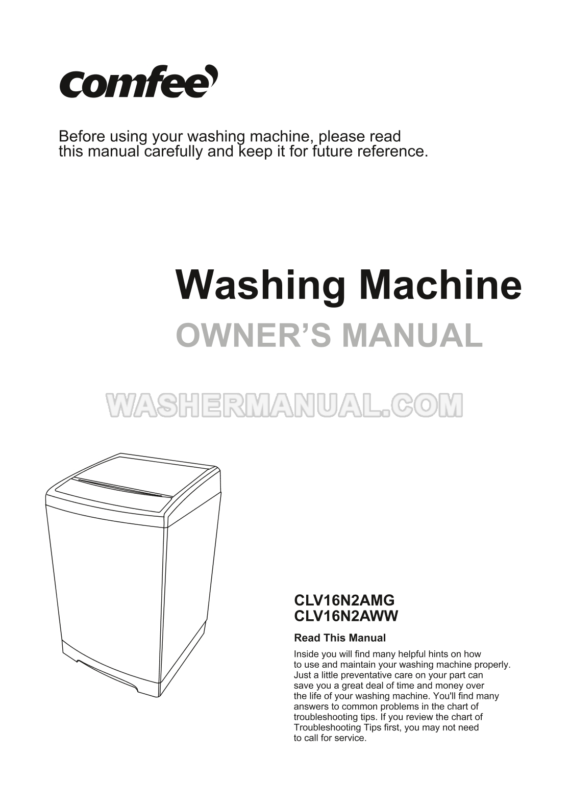 Owner's manual for Comfee CLV16N2AMG 1.6 cubic feet portable, fully automatic top-load washing machine designed for use in small living spaces such as apartments, RVs, and dormitories with top load on 35 pages.
