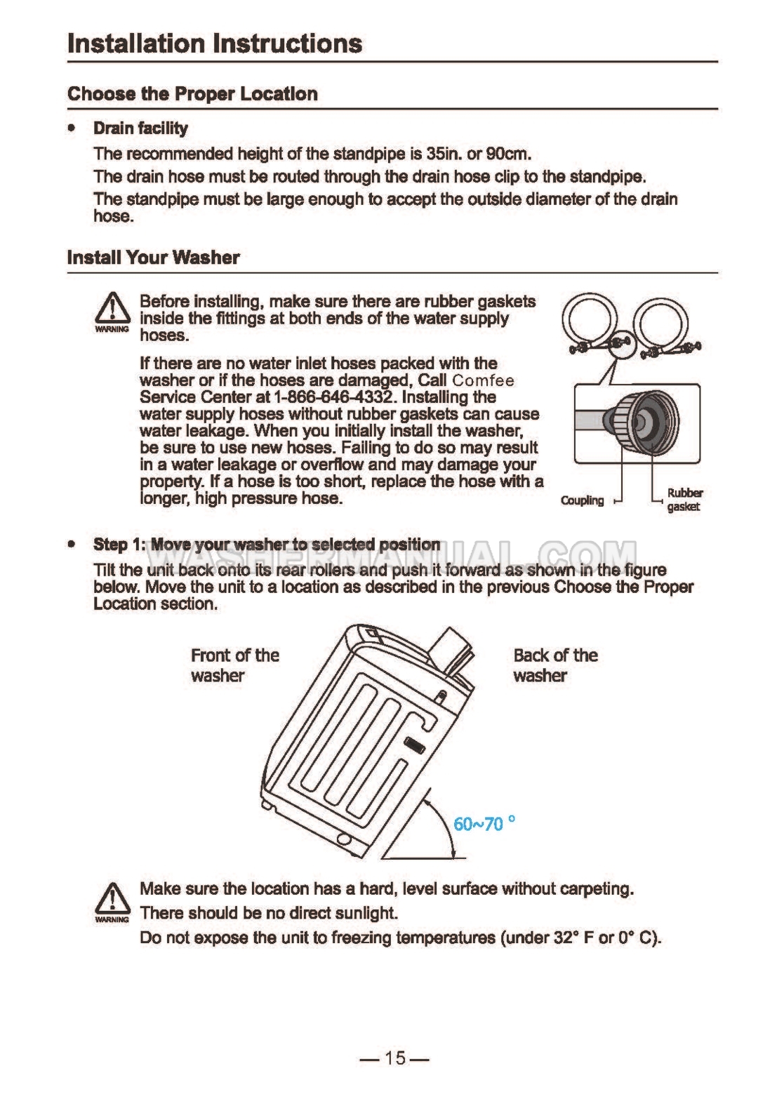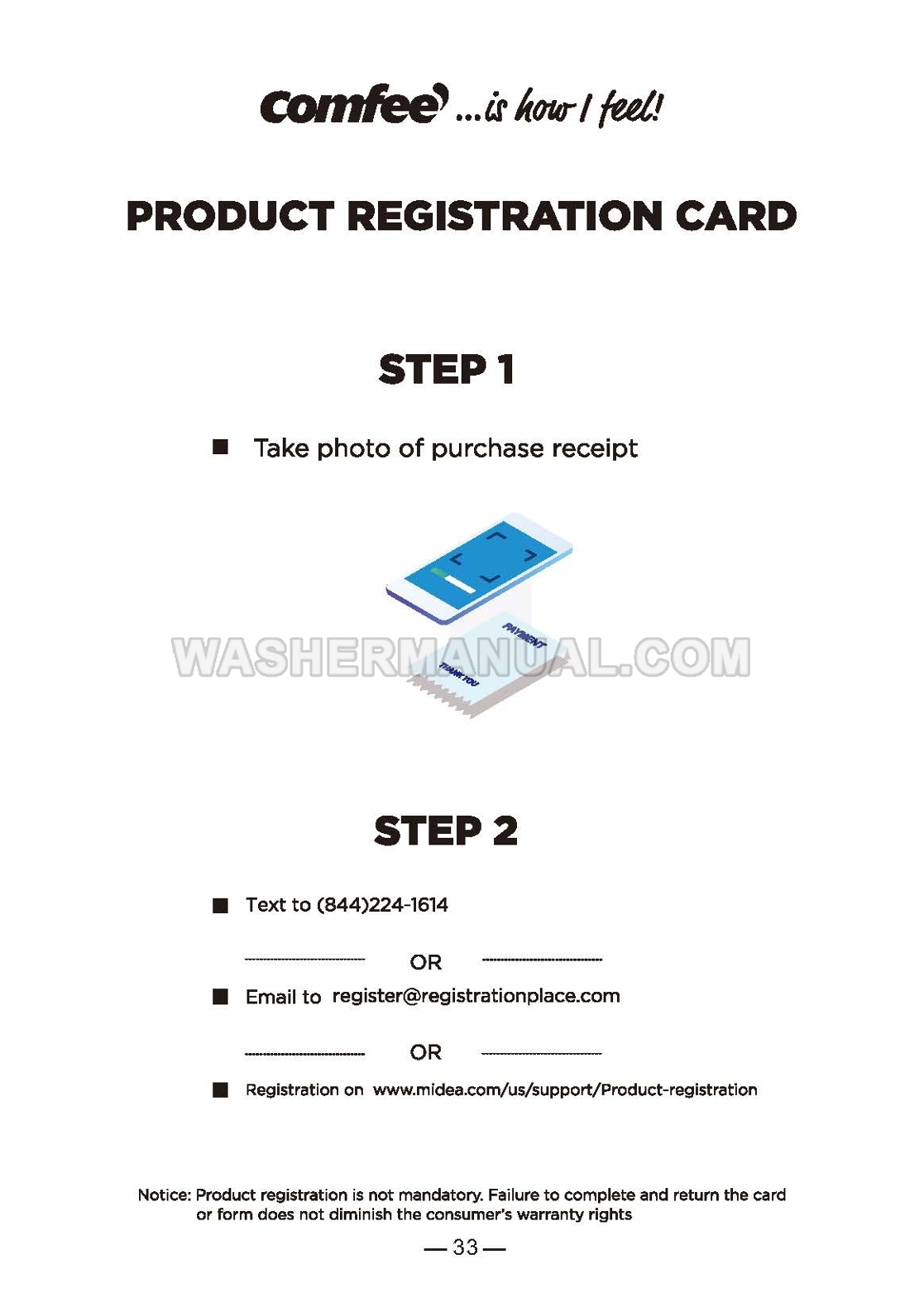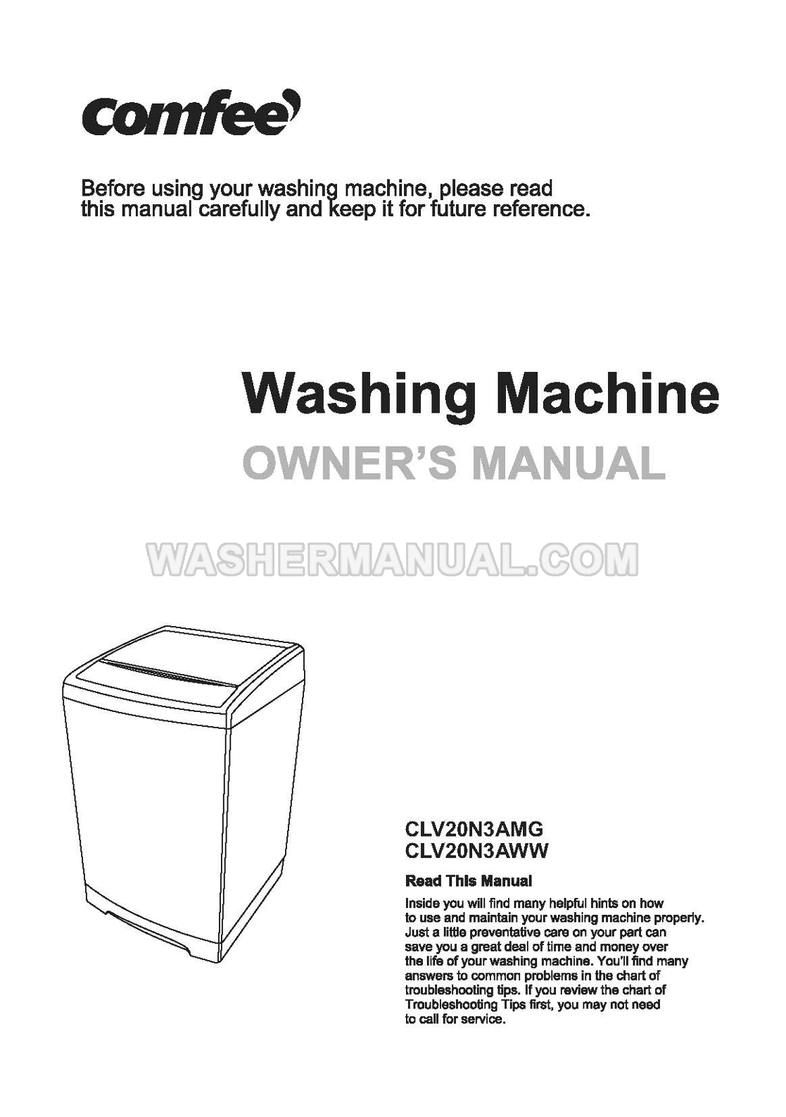 Owner's manual for Comfee CLV20N3AWW space-saving 2.0 cu.ft portable washer featuring delay start and reload, water temperature selection, tub clean function, Hygiene+ mode, and child lock for safer, more hygienic laundry laundry machine with top load on 35 pages.