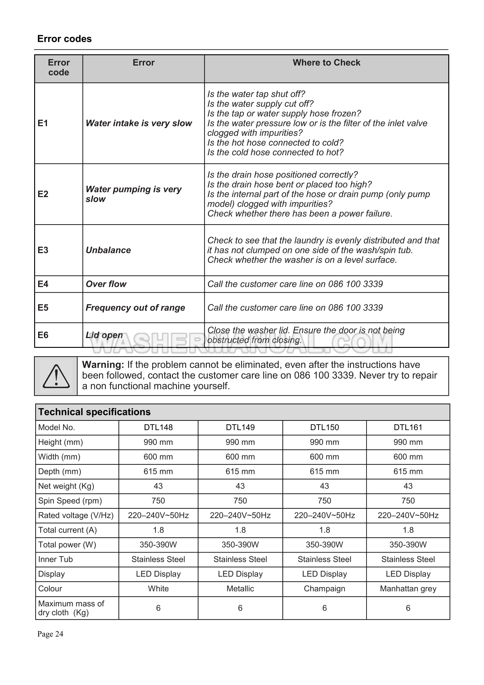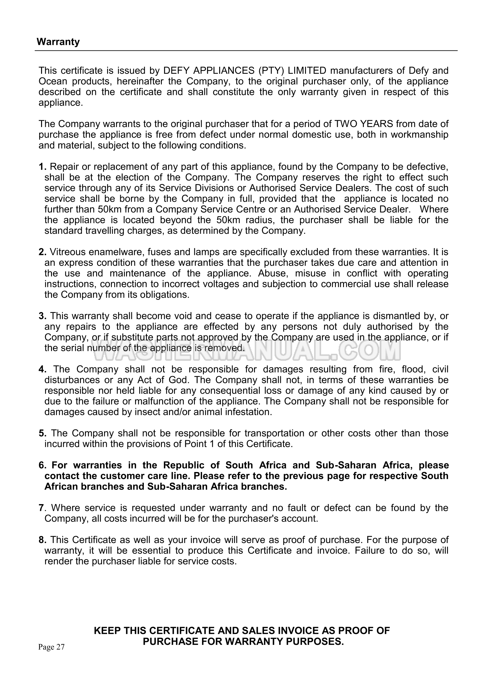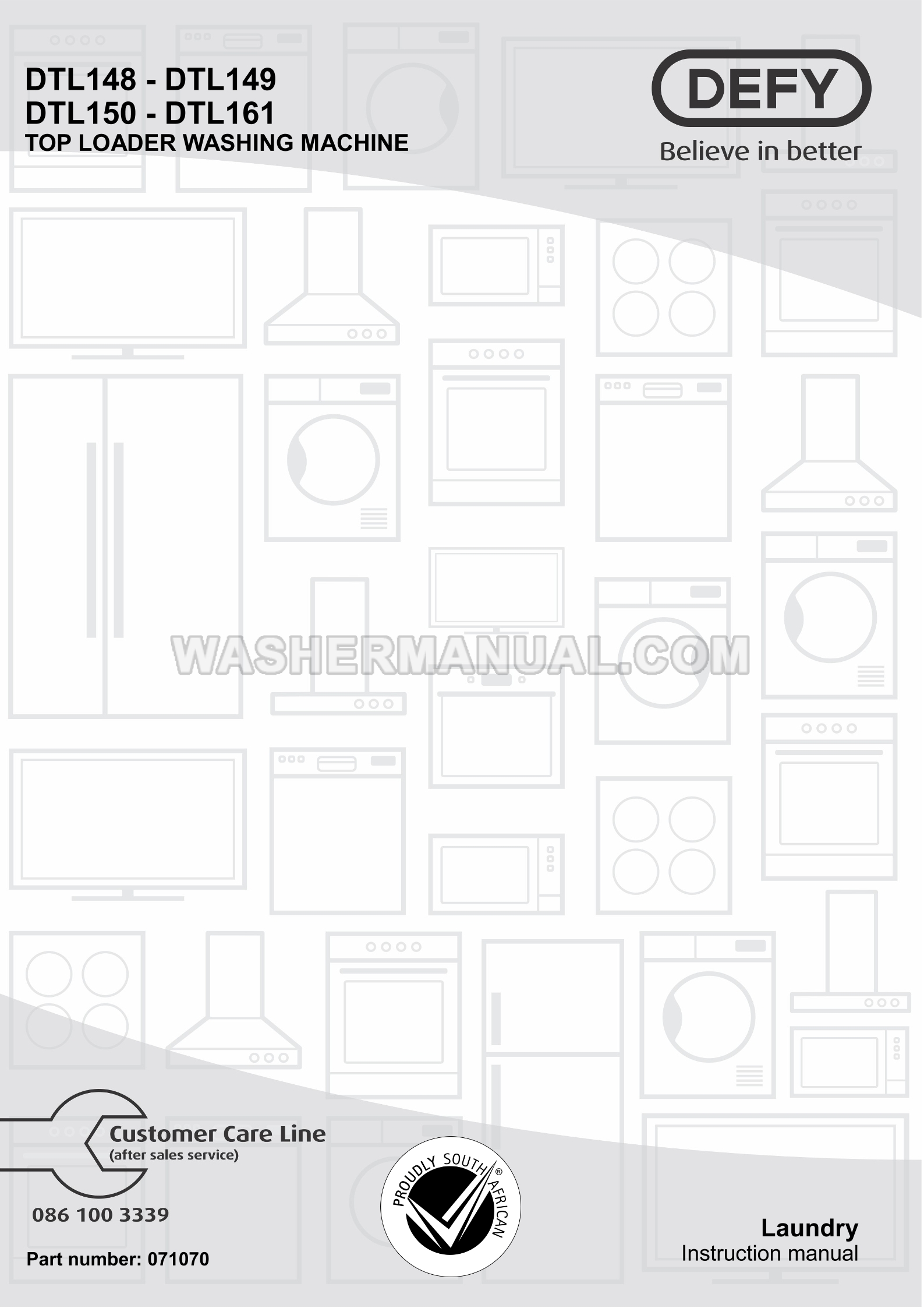 Instruction manual for Defy DTL149 innovative 13 kg top load washing machine featuring AquaWave friction-reducing drum and FountainWash for effortless, garment-friendly cleaning (DTL 149) on 27 pages.