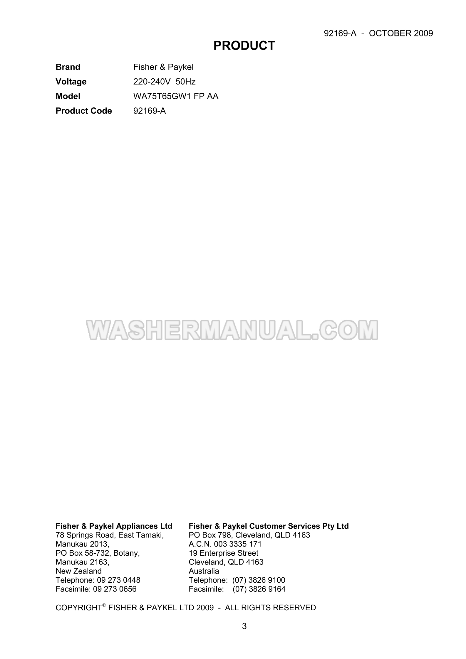 Fisher & Paykel WA75T65GW1 Parts Manual