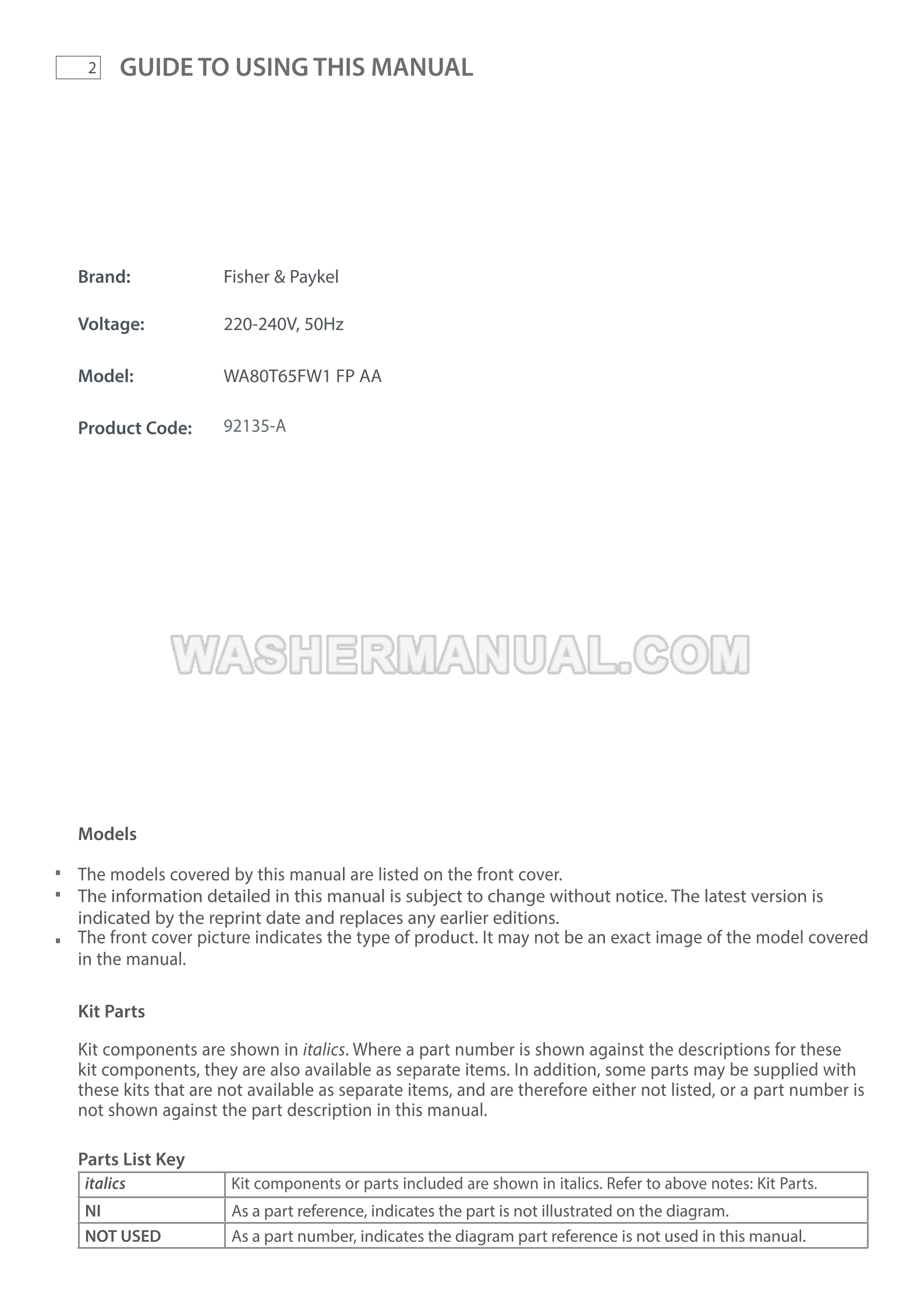 Fisher & Paykel WA80T65FW1 Parts Manual