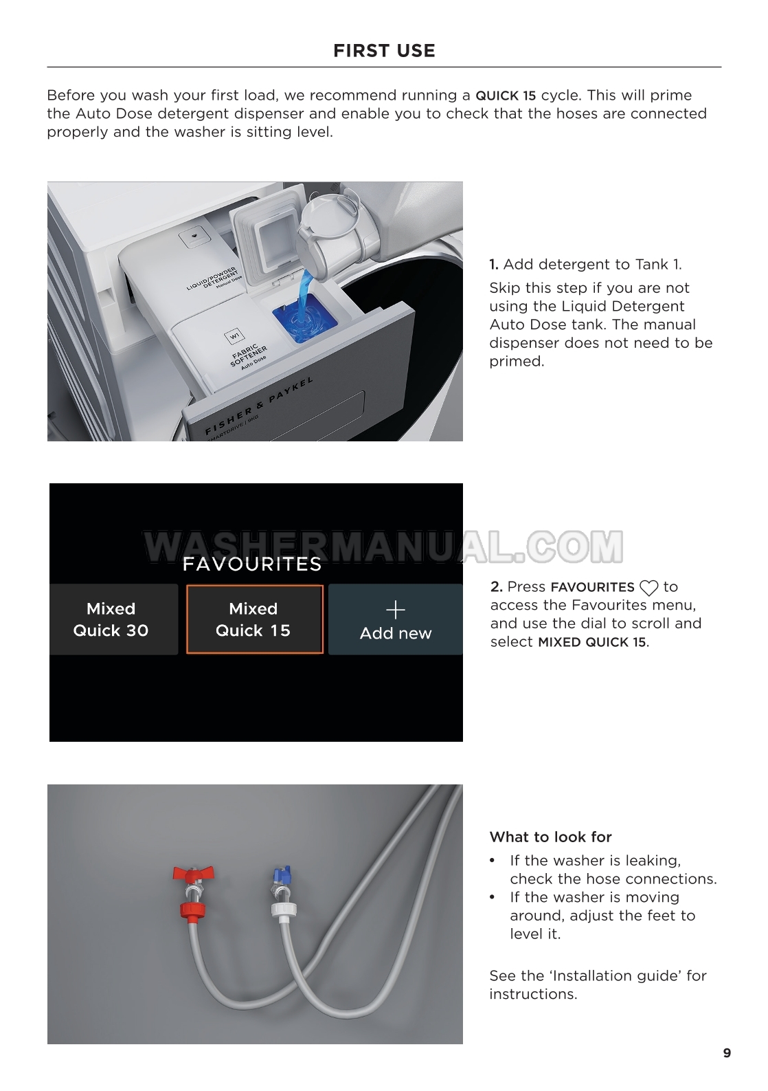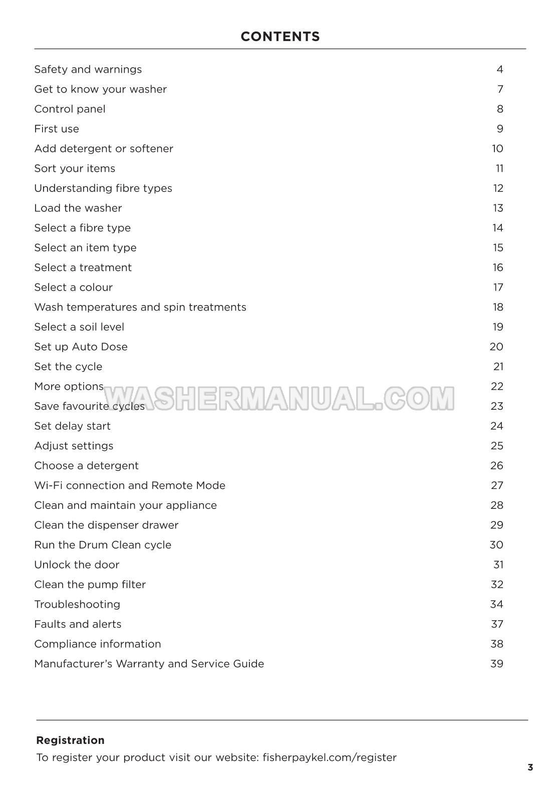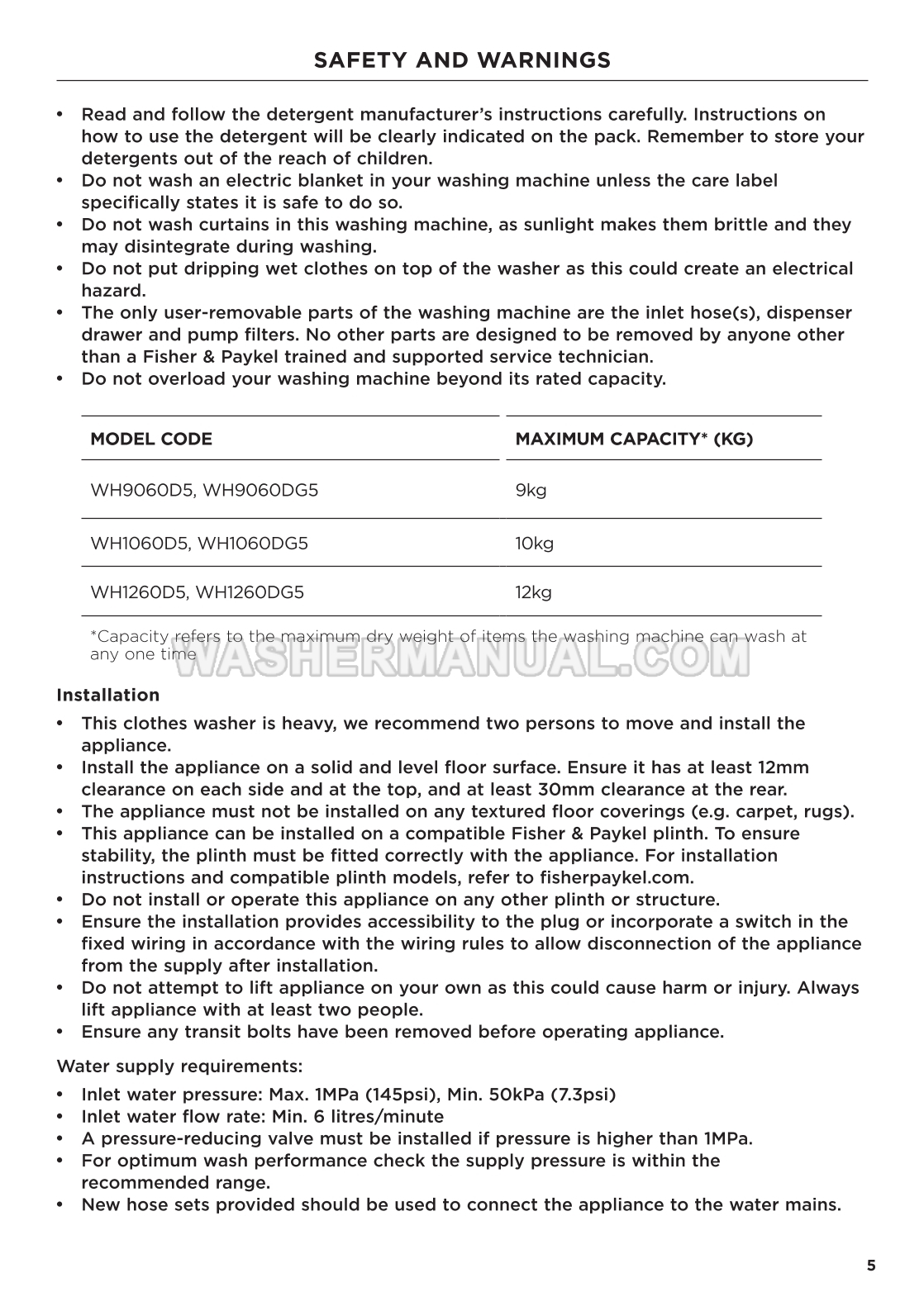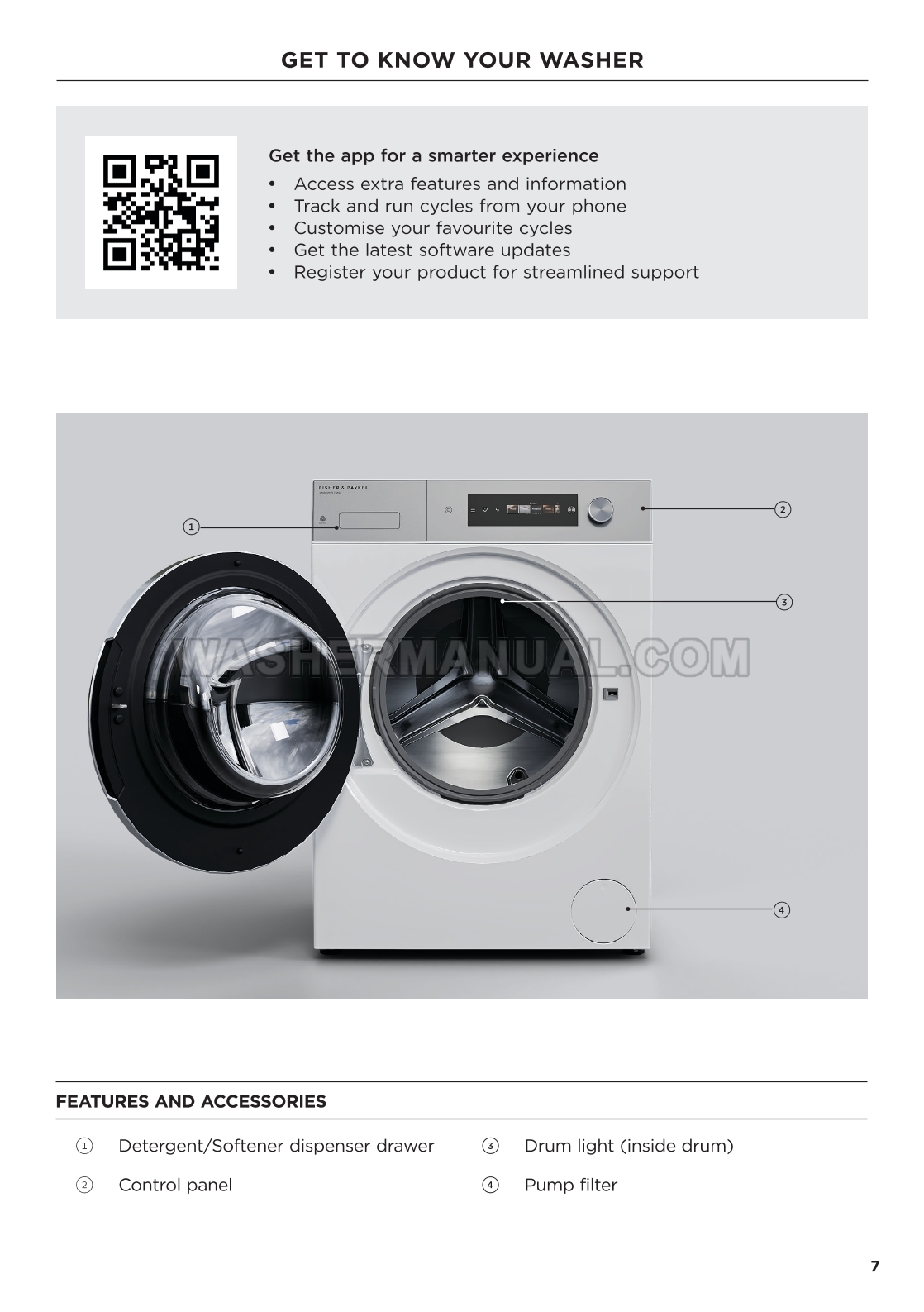 User guide for Fisher & Paykel WH1260DG5 Series 7 advanced 12kg front loader featuring 1400 rpm spin speed, 3.7" LCD display with dial and care for 6 fibre types including down laundry machine on 40 pages.