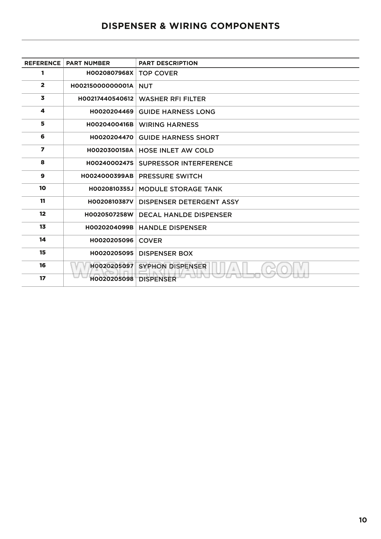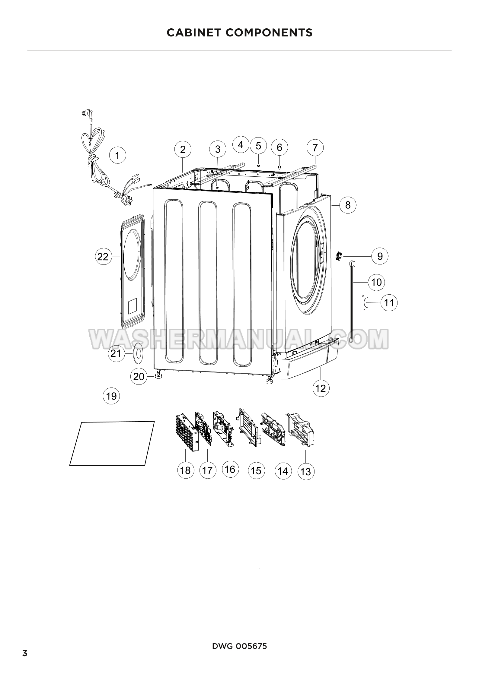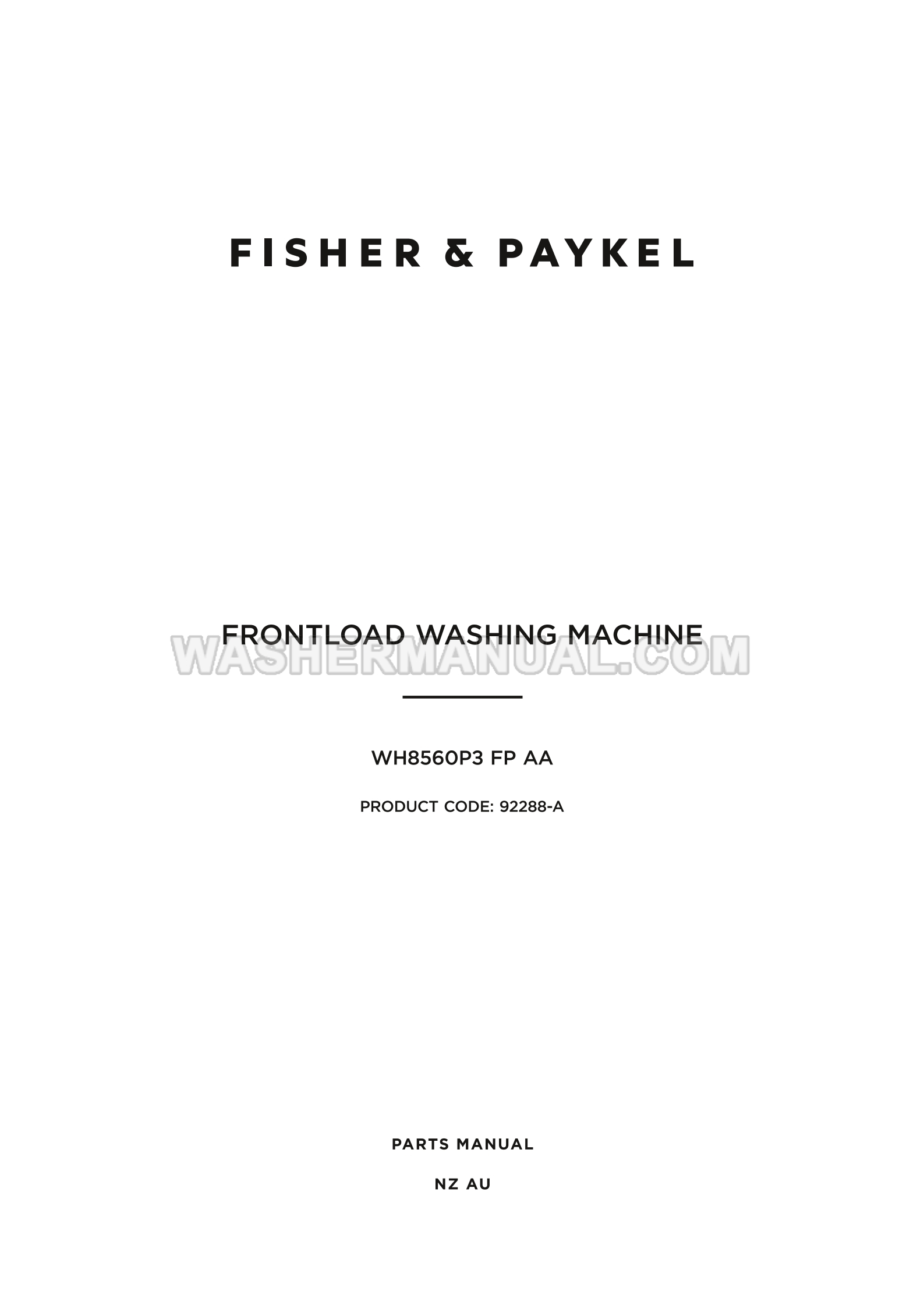 Parts manual for Fisher & Paykel WH8560P3 WashSmart 8.5kg capacity front-load washer with 1400 rpm maximum spin, Steam Care technology, Add a Garment function, and Woolmark certified Wool cycle for gentle fabric care laundry machine with front load on 16 pages.