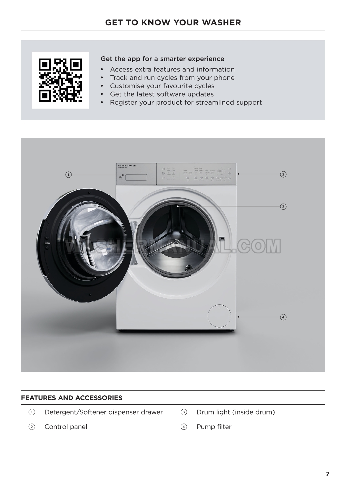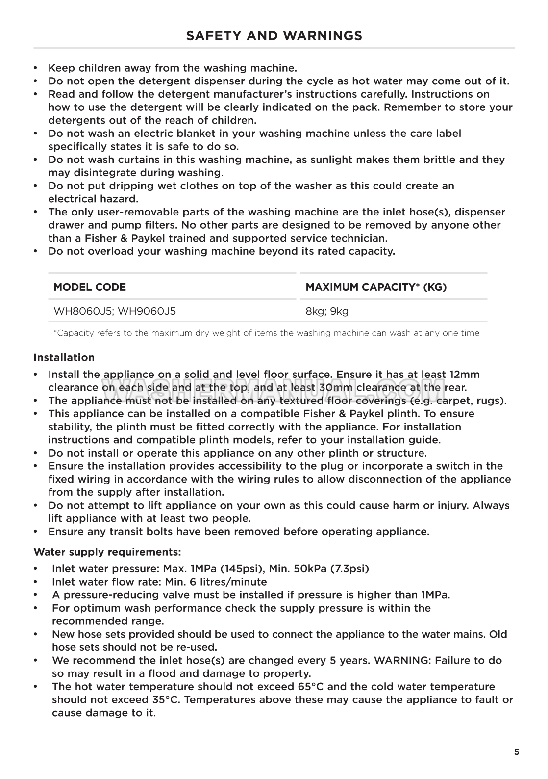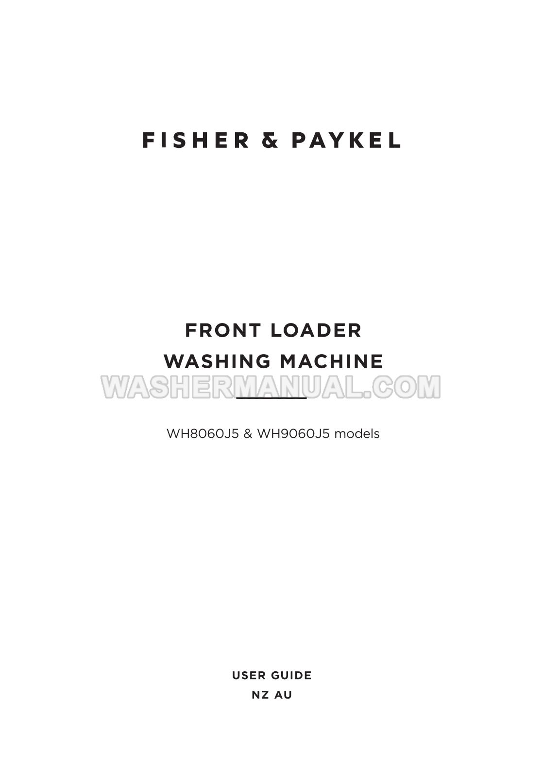 User guide for Fisher & Paykel WH9060J5 Series 5 versatile 9kg front load washer with 1400 rpm spin speed, sanitise cycle eliminating 99.9% bacteria, 5 star energy rating and woolmark black certified wool cycle laundry machine on 43 pages.
