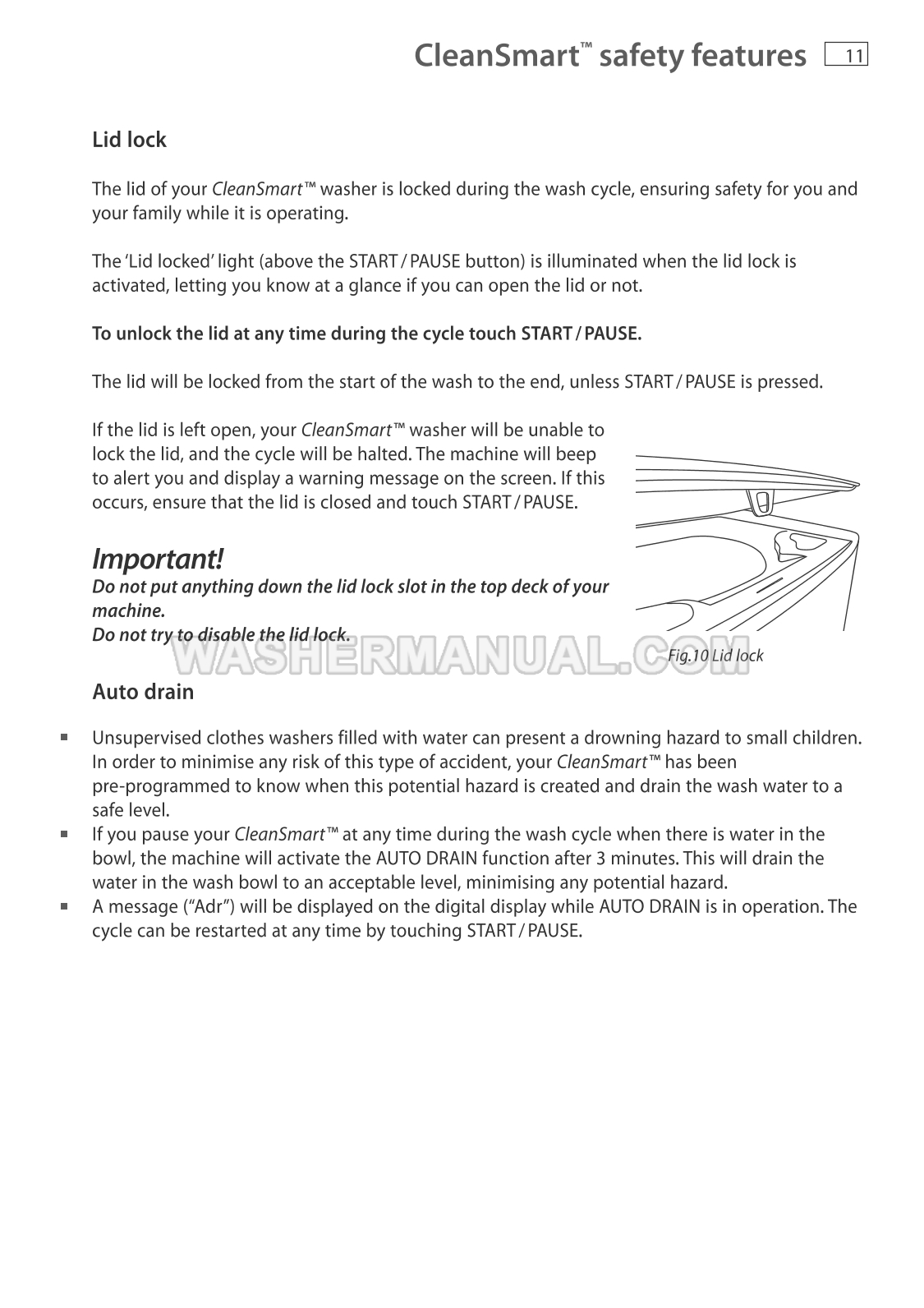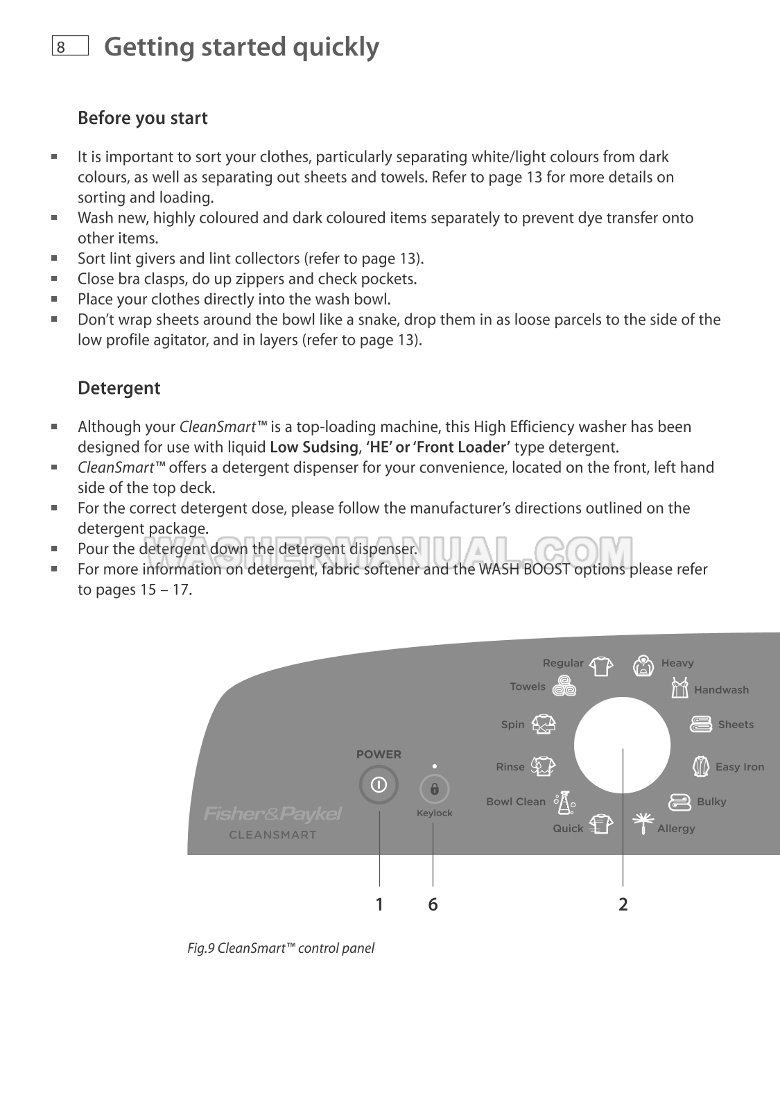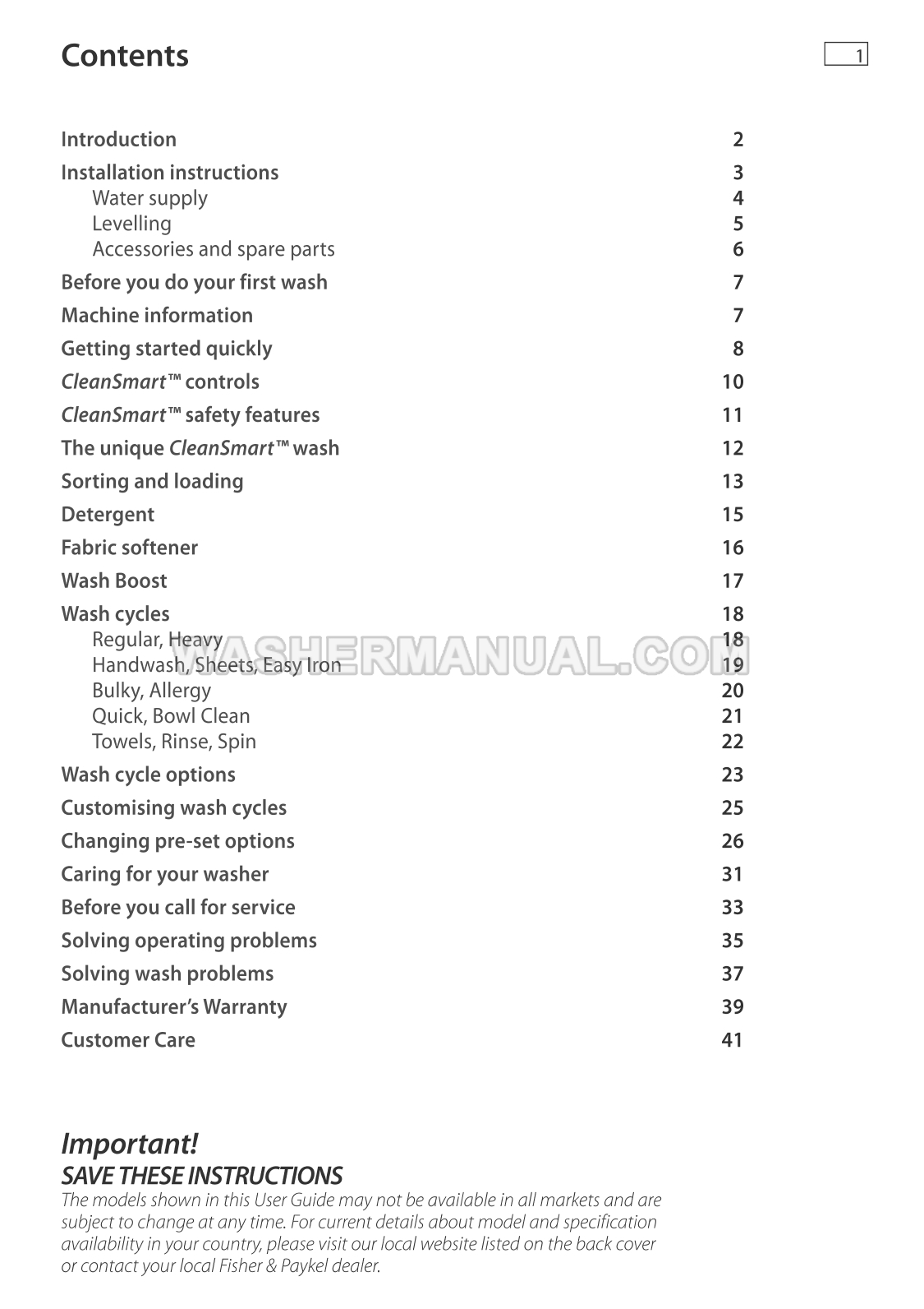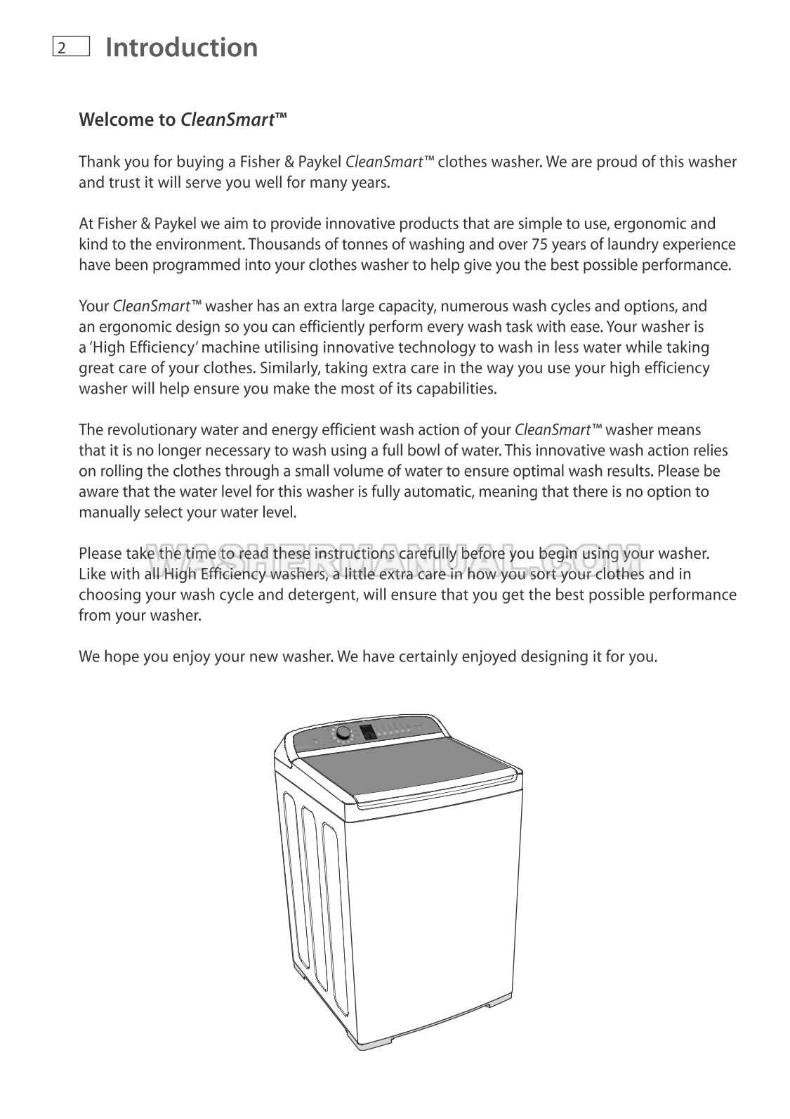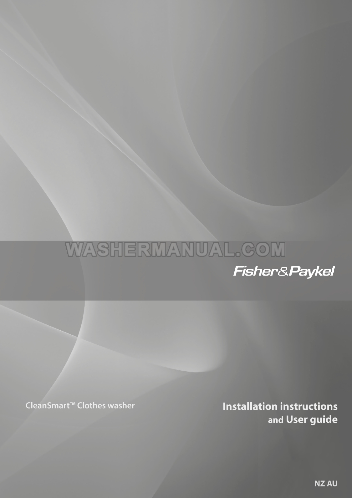 Installation instructions and user guide for Fisher & Paykel WL1068P1 CleanSmart water-efficient top-loading washer with 10kg capacity and 1100 RPM spin speed, featuring dual washing modes, auto water level, load sensing and stainless steel bowl ideal for larger families laundry machine on 44 pages.