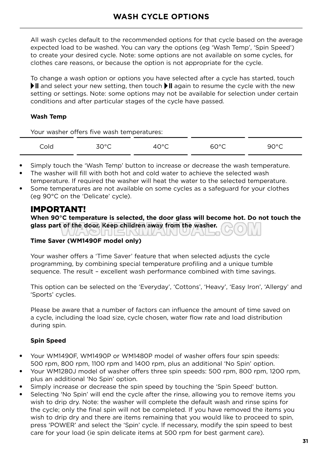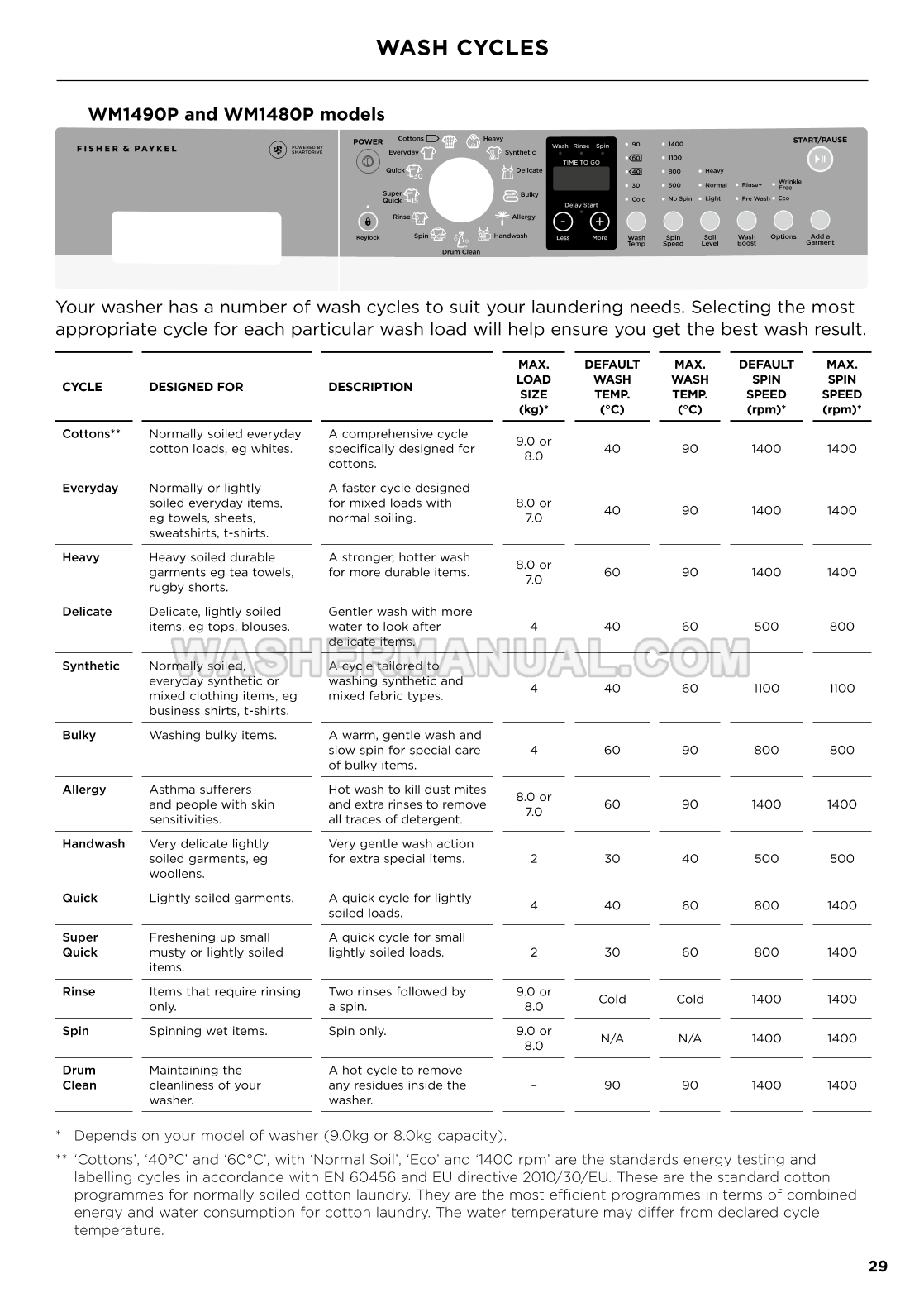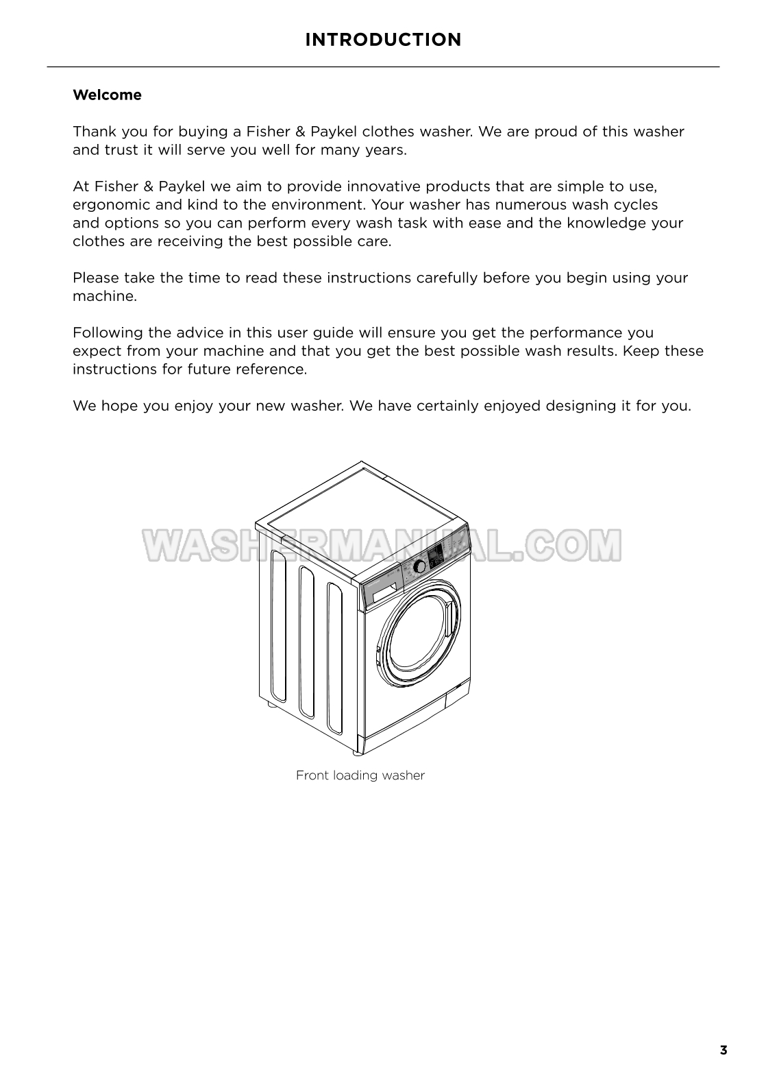 Installation & user guide for Fisher & Paykel WM1490F Series 3 freestanding 9 kg washing machine with 1400 rpm spin offering Vortex Wash and Steam Refresh cycles to manage diverse fabric loads efficiently on 56 pages.