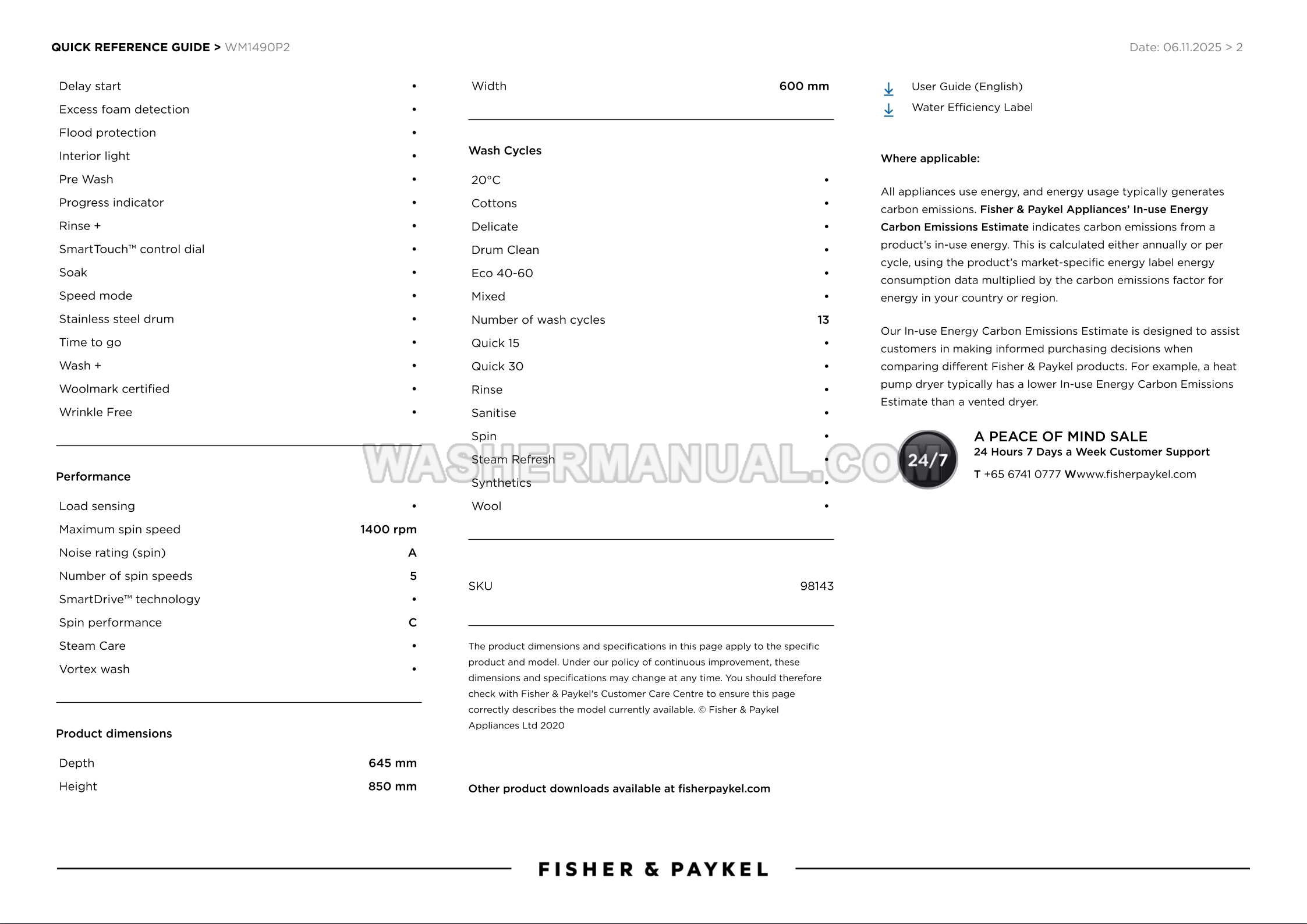 Fisher & Paykel WM1490P2 Specifications Sheet