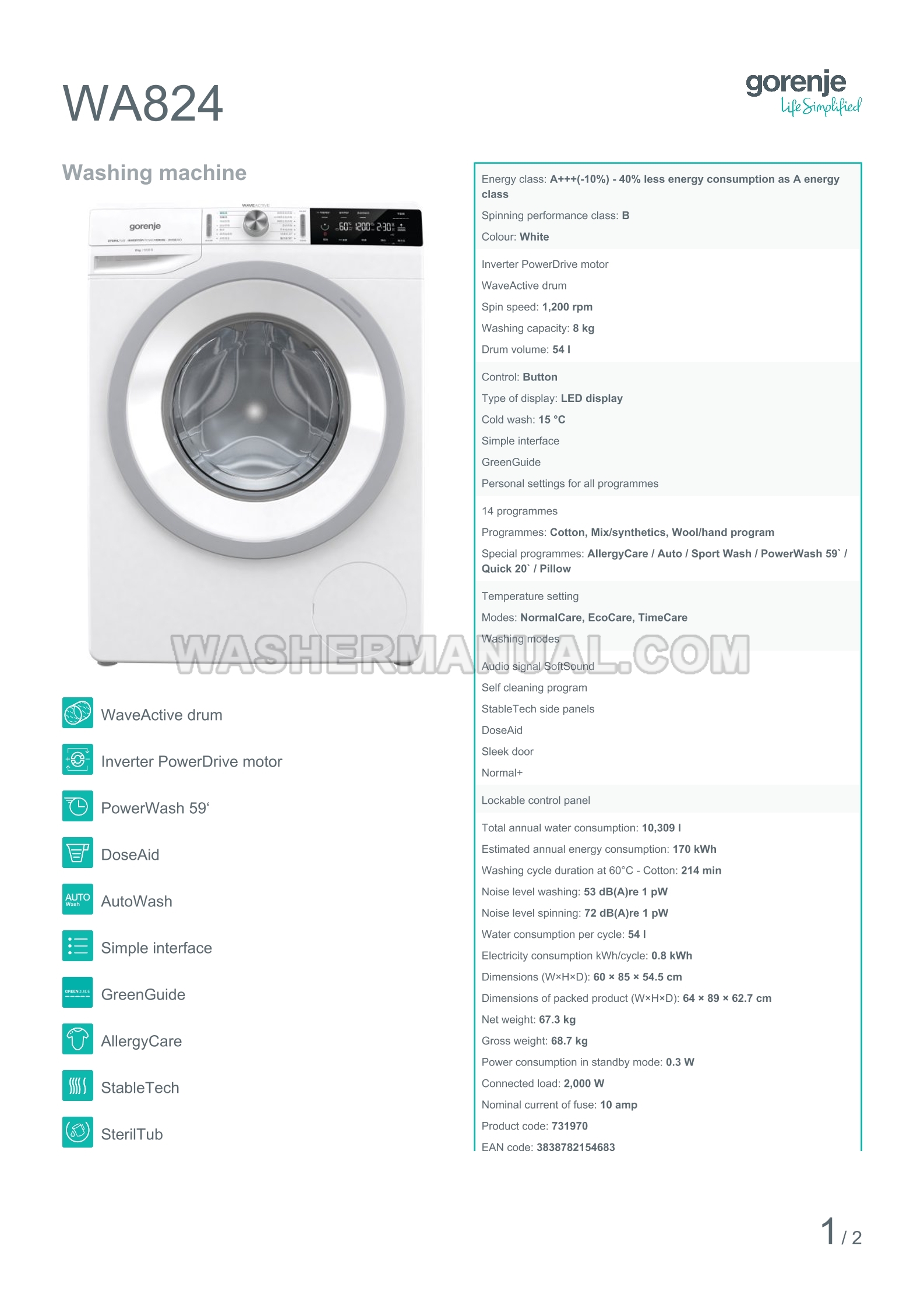 Specifications sheet for Gorenje WA824 front-load washing machine with 8 kg capacity and 1,200 rpm spin speed, featuring inverter motor efficiency, WaveActive drum care and 14 programs including AllergyCare, Auto and PowerWash 59' for everyday laundry with front load on 2 pages.