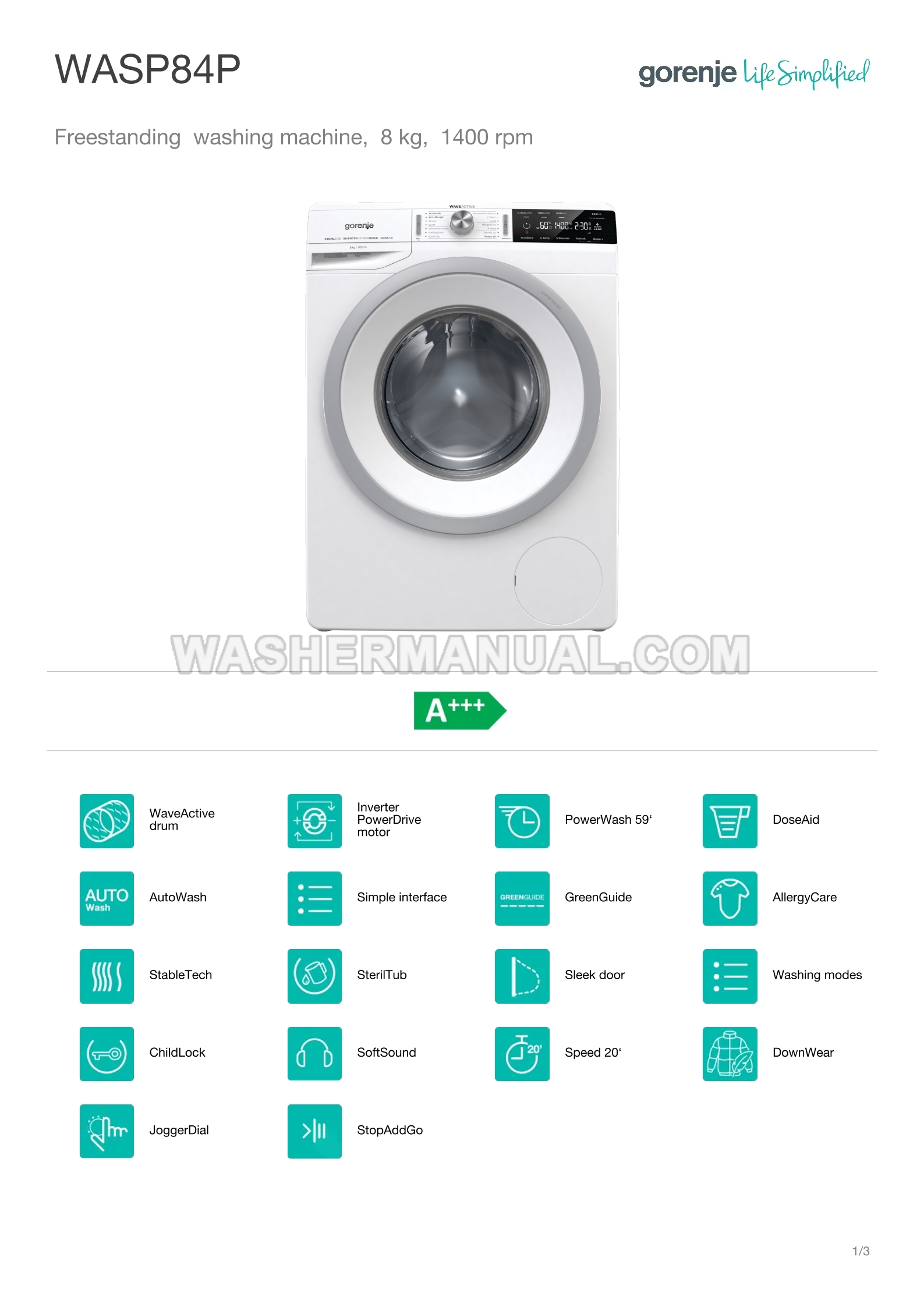Specifications sheet for Gorenje WASP84P 8 kg washing machine with 1400 rpm spin speed featuring WaveActive drum, Inverter PowerDrive motor, and smart functions like DoseAid, AutoWash, and AllergyCare for efficient and gentle cleaning with front load on 3 pages.