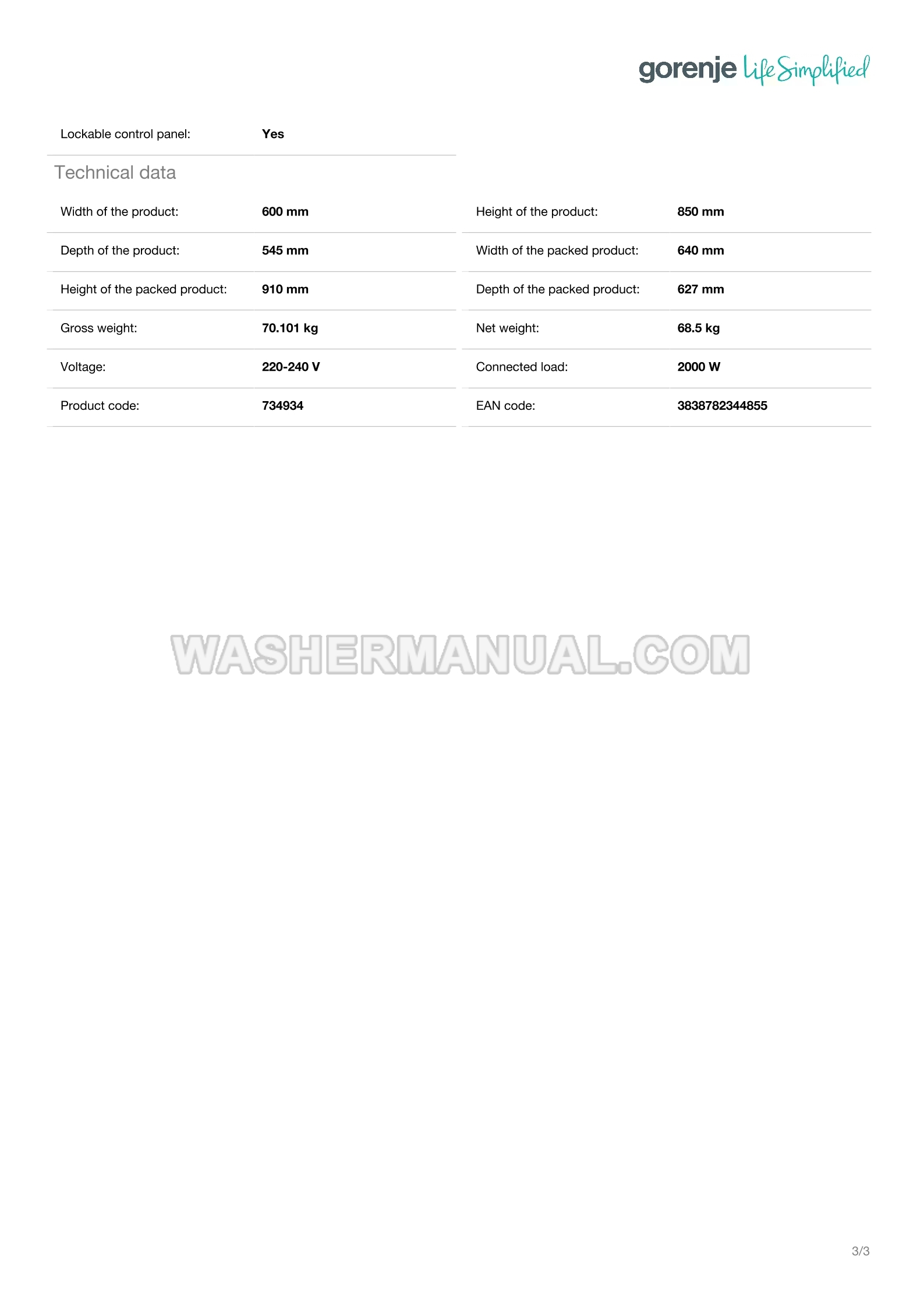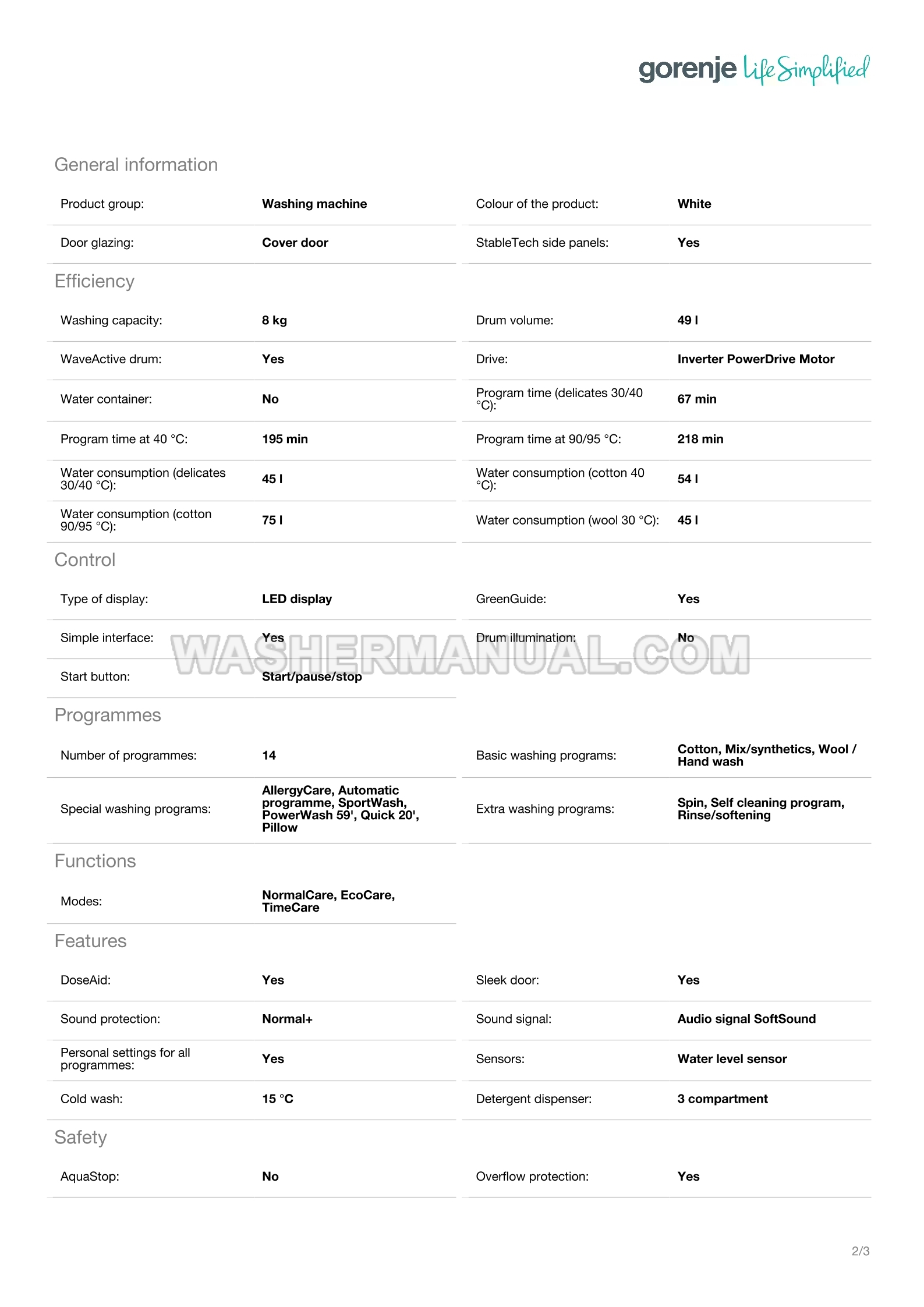 Gorenje WASP84P Specifications Sheet