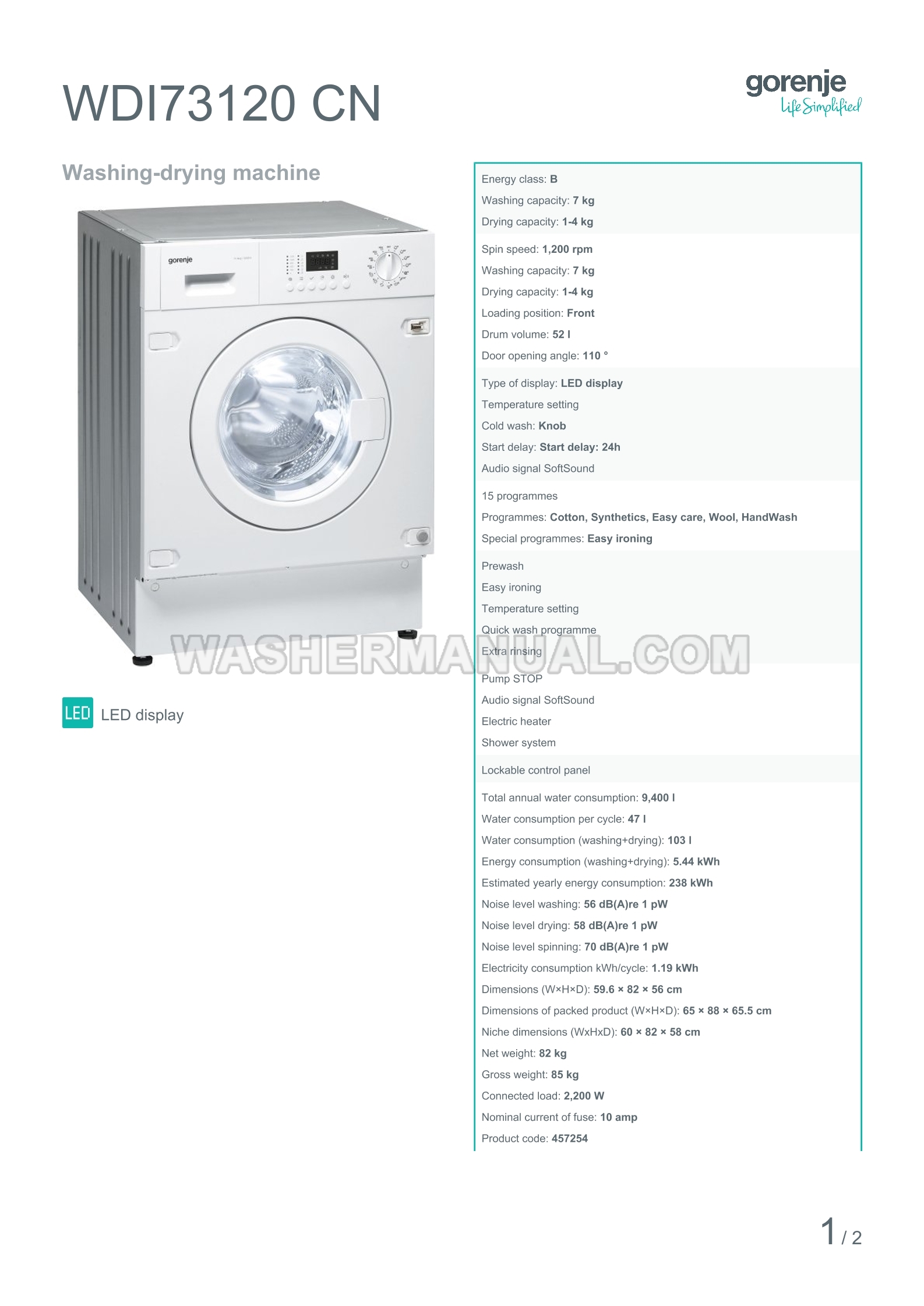 Specifications sheet for Gorenje WDI73120 CN front-load washer-dryer with 7 kg wash capacity, 1-4 kg drying load and 1,200 rpm spin speed, offering 15 programs with quick wash, Easy care and extra rinsing in a built-in-friendly size laundry machine on 2 pages.