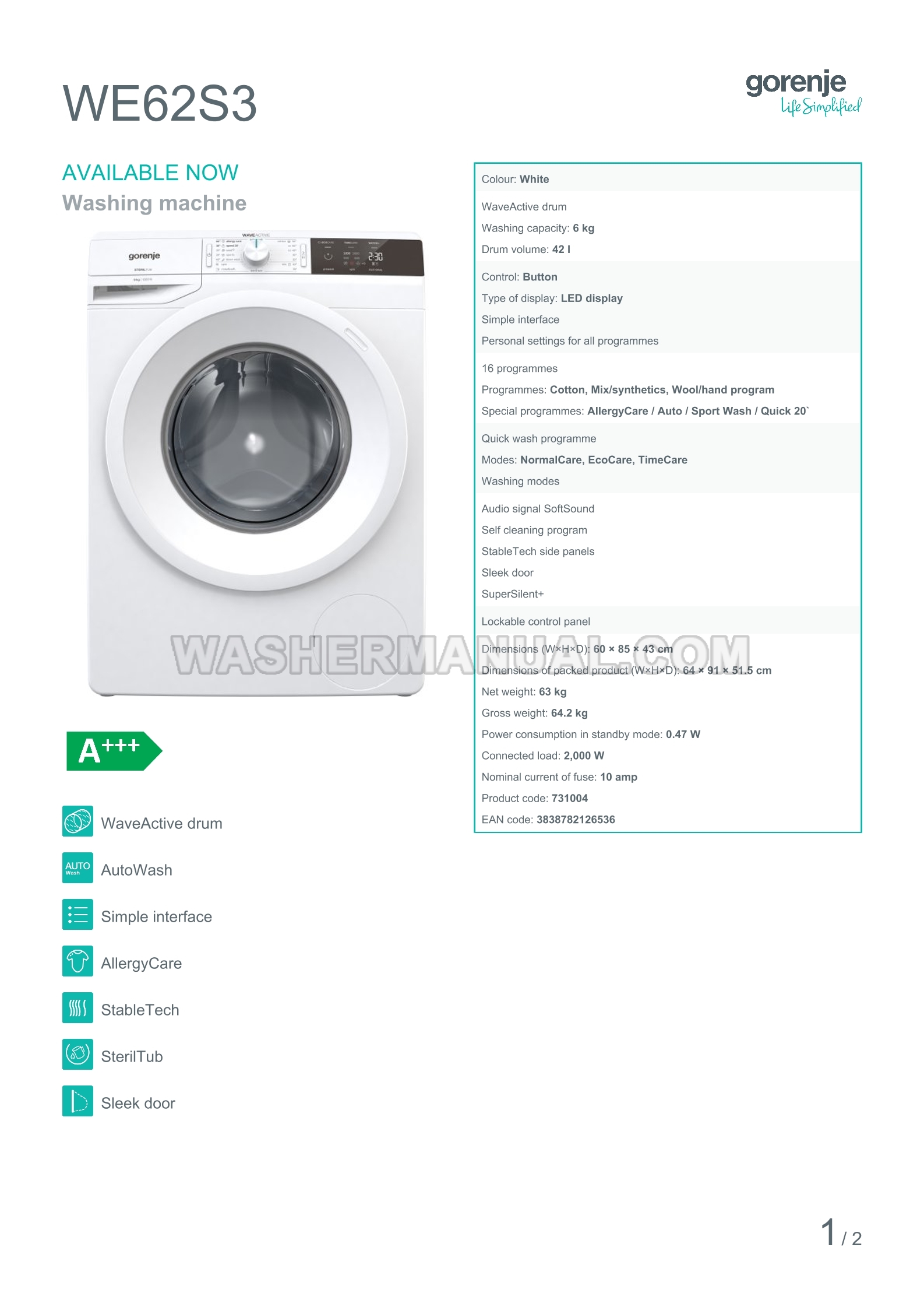 Gorenje WE62S3 Specifications Sheet
