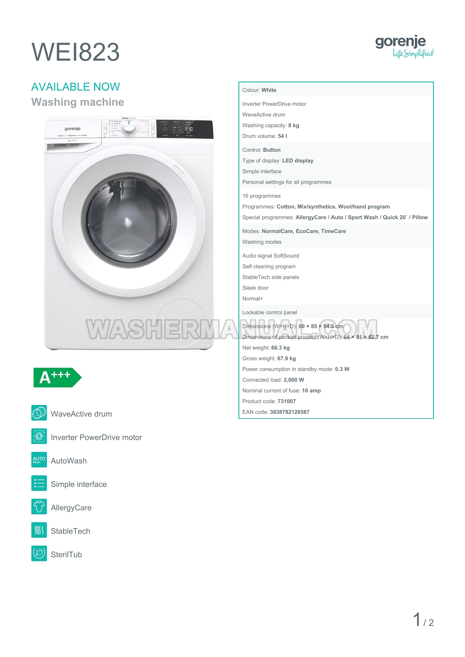 Specifications sheet for Gorenje WEI823 efficient front-load washer with 8 kg capacity, 54 l drum, LED control panel and inverter motor featuring EcoCare and TimeCare modes for optimized performance laundry machine with front load on 2 pages.