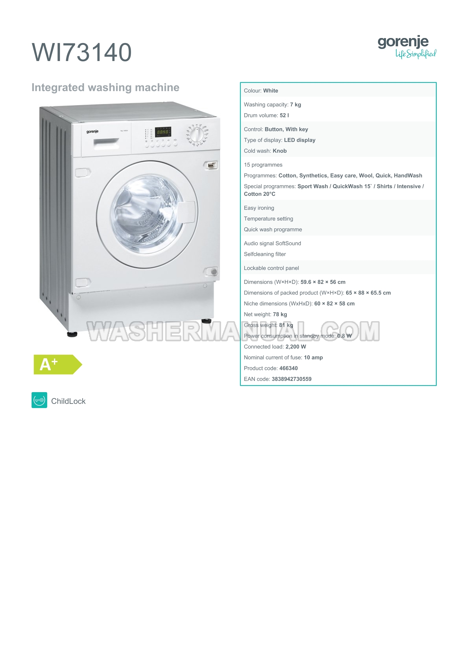 Specifications sheet for Gorenje WI73140 built-in front-load washer with 7 kg capacity, LED display and easy control knob featuring Sport Wash, Intensive and Easy Ironing options laundry machine with front load on 1 pages.
