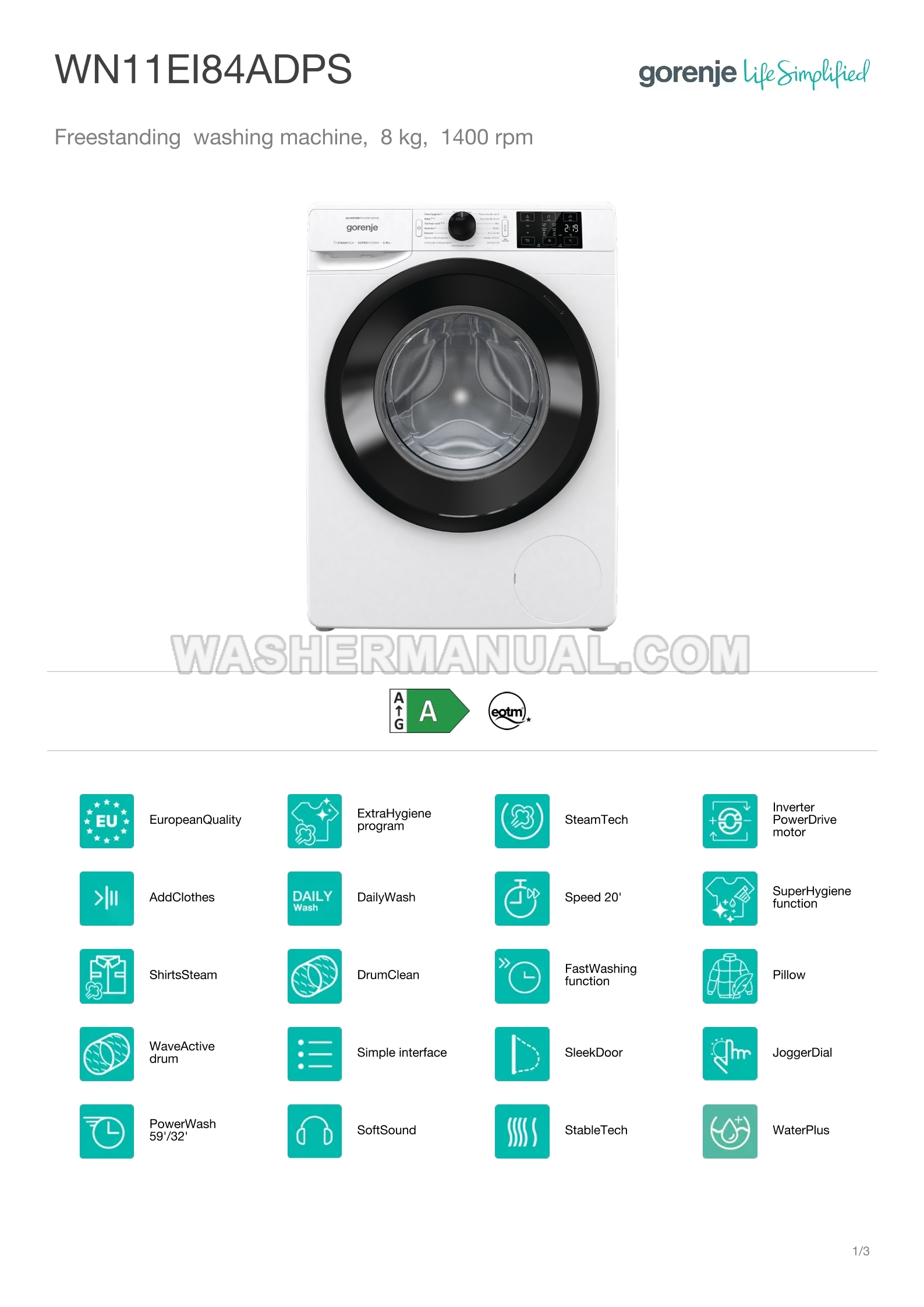 Specifications sheet for Gorenje WN11EI84ADPS efficient 8 kg washing machine with 1400 rpm spin speed featuring SteamTech Inverter PowerDrive motor, ExtraHygiene and Speed 20' programs, and WaveActive drum for gentle yet powerful cleaning with front load on 3 pages.