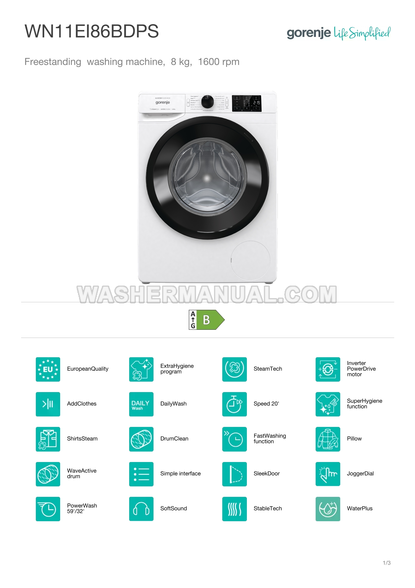 Specifications sheet for Gorenje WN11EI86BDPS washing machine with 8 kg capacity and 1600 rpm spin speed featuring SteamTech hygiene care, inverter PowerDrive motor, and WaveActive drum for fast, deep, and gentle cleaning with front load on 3 pages.