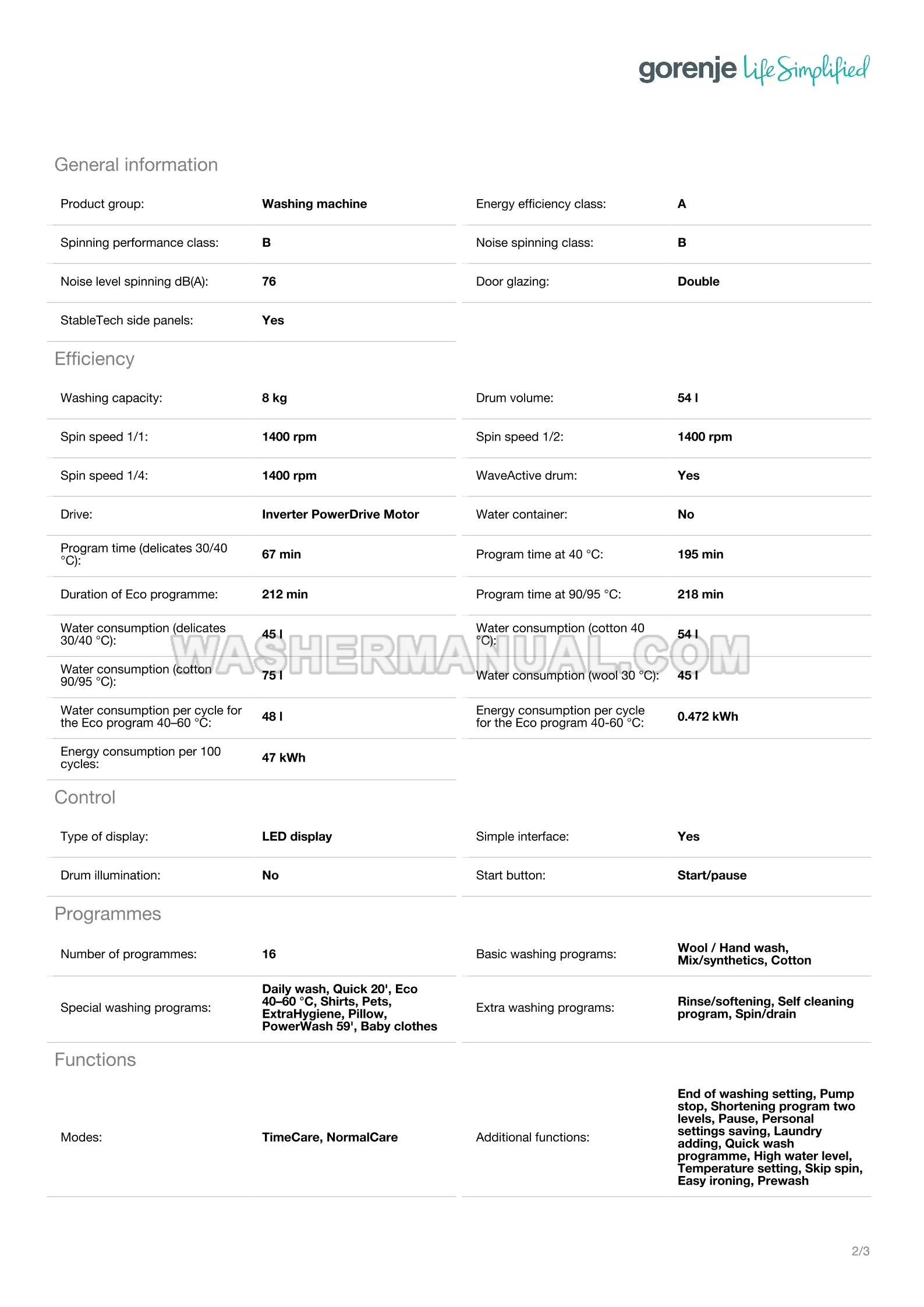 Specifications sheet for Gorenje WNFHEI84ADPS washing machine with 8 kg capacity and 1400 rpm spin speed featuring SteamTech and SuperHygiene functions, inverter PowerDrive motor, and WaveActive drum for powerful and fabric-friendly cleaning with front load on 3 pages.