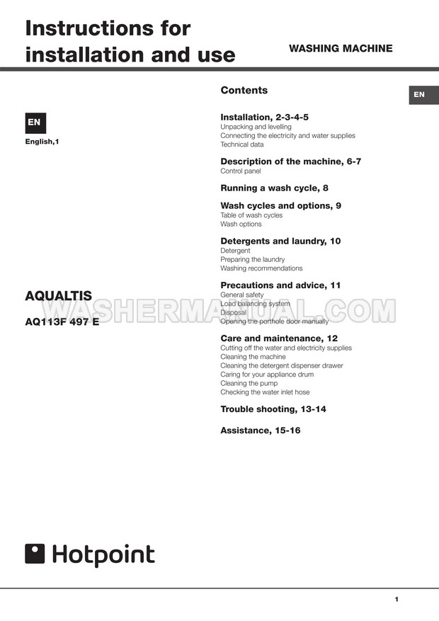 Instructions for installation and use for Hotpoint AQ113F 497 E Aqualtis laundry machine with front load on 16 pages.