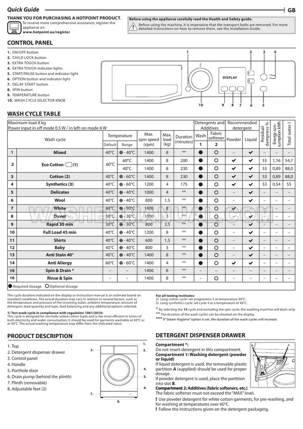 Washer Manual Hotpoint NSWM 843CW Quick Guide Hotpoint NSWM 843CW Quick Guide Rating 5.0 (votes: 1) Description Quick guide for Hotpoint NSWM 843CW laundry machine with front load on 4 pages.
