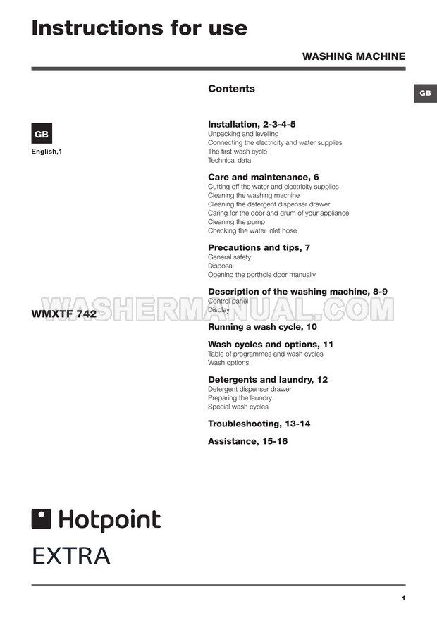 Washer Manual Hotpoint WMXTF 742P Instructions for Use Hotpoint WMXTF 742P Instructions for Use Rating 5.0 (votes: 1) Description Instructions for use for Hotpoint WMXTF 742P Extra laundry machine with front load on 16 pages.