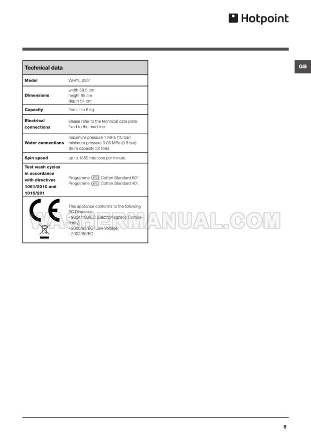 Washer Manual Hotpoint WMYL 6351 Instructions for Use Hotpoint WMYL 6351 Instructions for Use Rating 5.0 (votes: 1) Description Instructions for use for Hotpoint WMYL 6351 Style laundry machine with front load on 16 pages.
