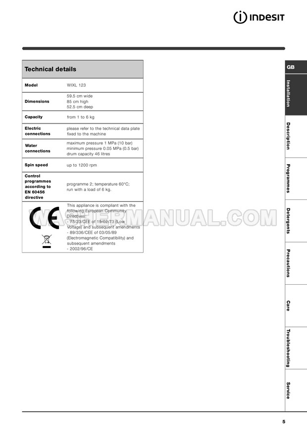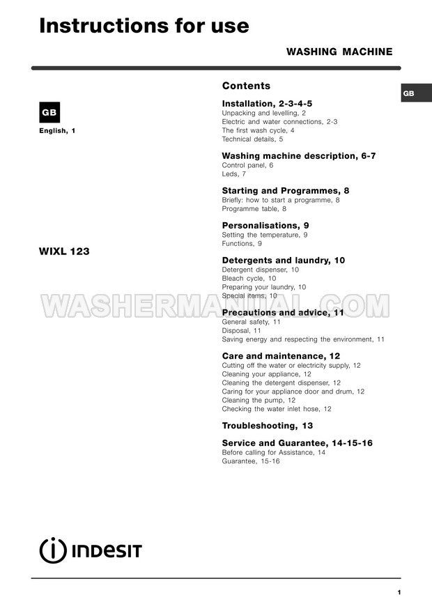 Washer Manual Indesit WIXL 123 Instructions for Use Indesit WIXL 123 Instructions for Use Rating 5.0 (votes: 1) Description Instructions for use for Indesit WIXL 123 laundry machine with front load on 16 pages.