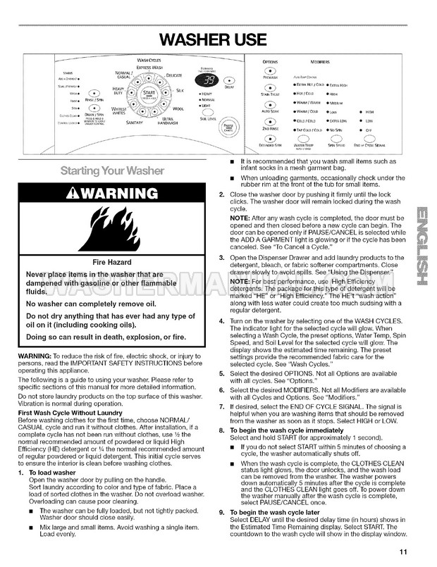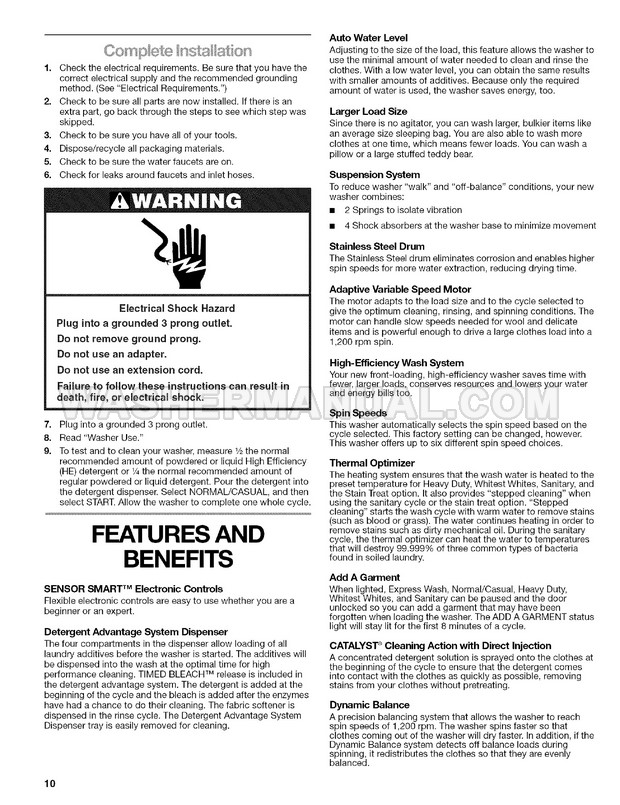 Owner's manual and installation instructions for Kenmore 4493 Elite HE3t laundry machine with front load on 20 pages.